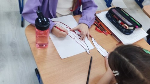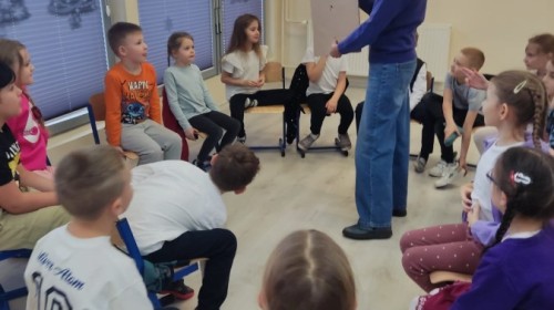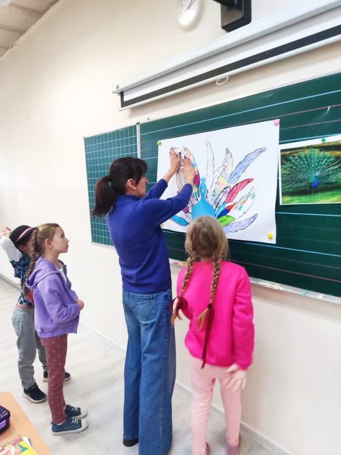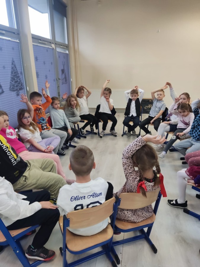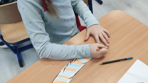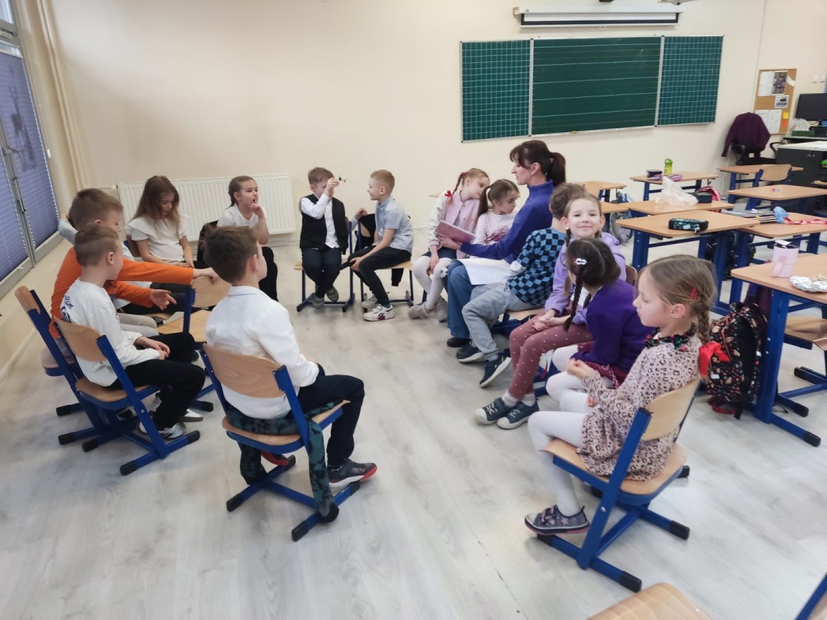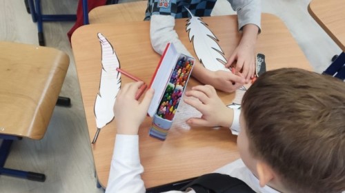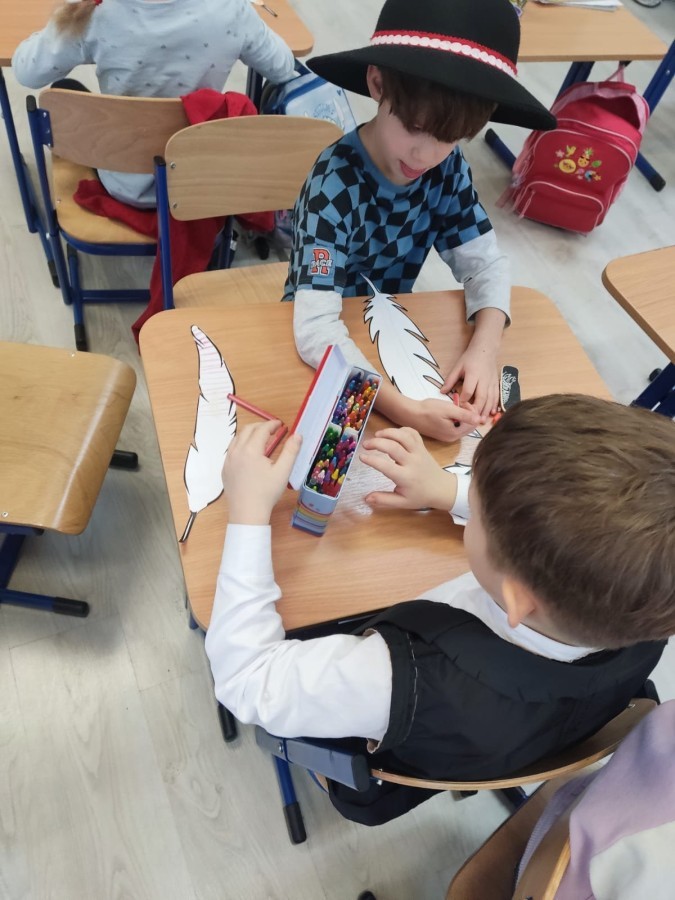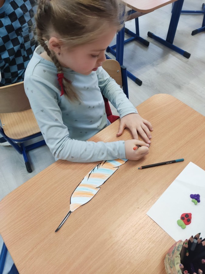 30 stycznia 2026 roku uczniowie klasy 1c, w ramach zajęć świetlicowych, uczestniczyli w zajęciach z bajkoterapii, które poprowadziła pani Katarzyna Mielimonka z Wojewódzkiej Biblioteki Pedagogicznej w Bielsku-Białej. Dzieci z dużym zaangażowaniem brały udział w czytaniu książki pt. „O pawiu, co miał ogon z przyjaźni”. Poprzez słuchanie opowieści uczniowie uczyli się, czym są przyjaźń i empatia. Po wysłuchaniu bajki dzieci kolorowały pióra, a następnie przyklejały je do dużego tułowia pawia, tworząc wspólne, barwne dzieło.