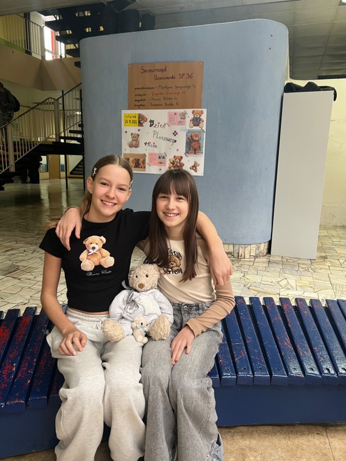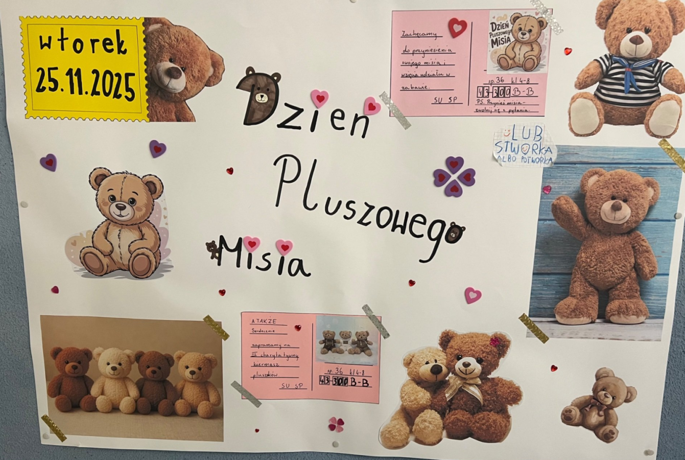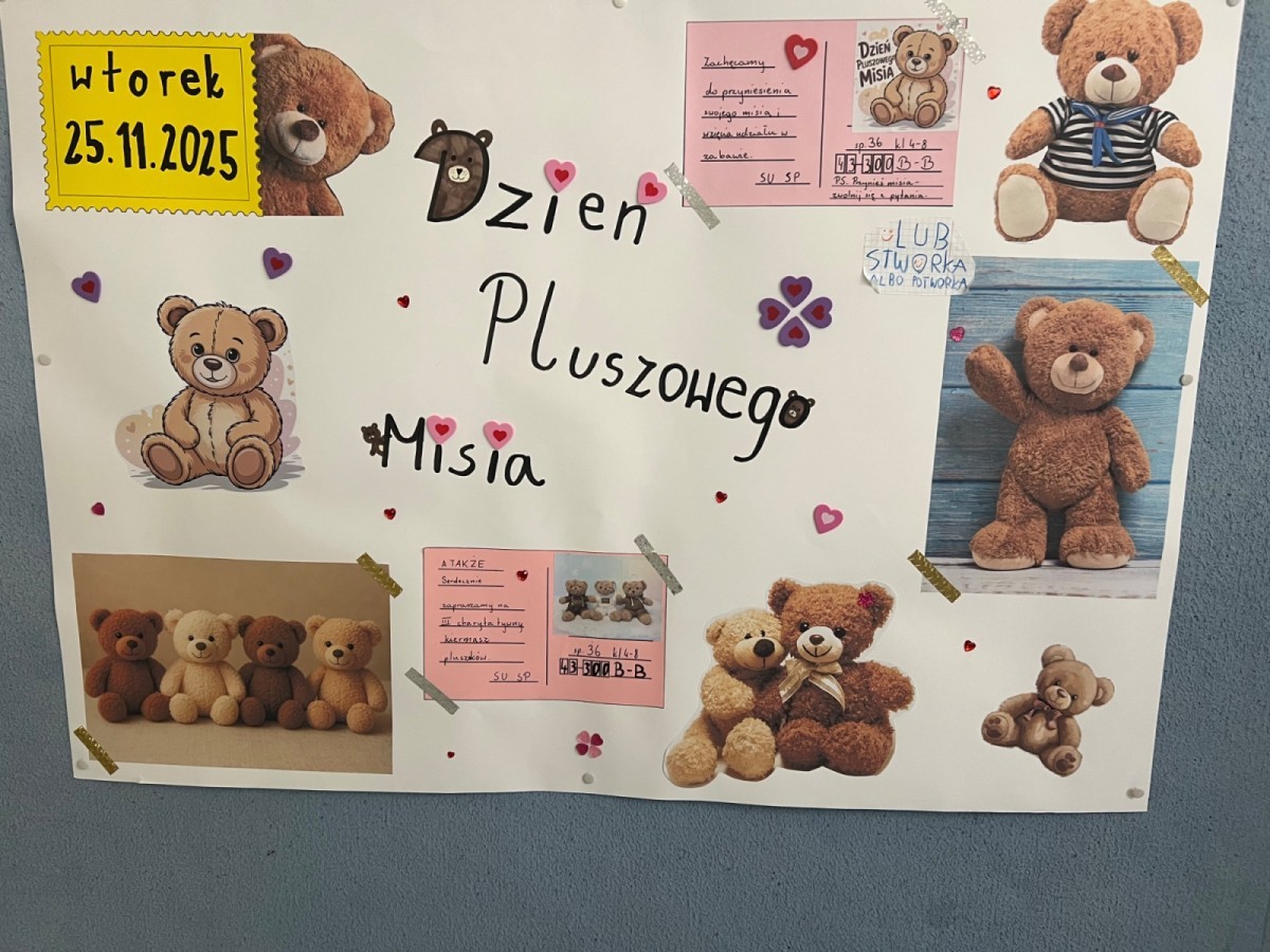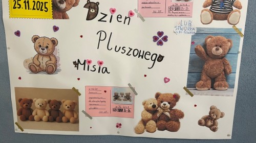 Małe, duże, nowiutkie i starsze, czasem lekko podniszczone - misie wszelkiej maści zawitały dziś do naszej szkoły, żeby umilić nam dzień. Dzieciaki wybroniły od niezapowiedzianego odpytywania, a i nam, dorosłym przyniosły wiele radości. Każdy przecież, nieważne mały czy duży, uśmiechnie się na widok tego kochanego pluszaka. A wszystko to z okazji obchodzonego dziś w naszej szkole Światowego Dnia Misia. Pluszaki przybyły do naszej szkoły na specjalne zaproszenie Samorządu Uczniowskiego.