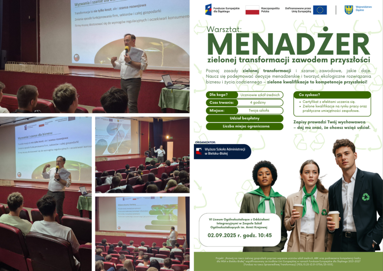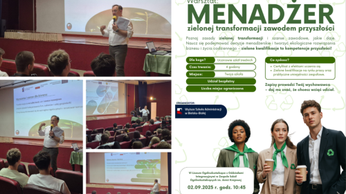 2 września 2025 roku wzięli udział w specjalistycznych warsztatach poświęconych zielonej transformacji i zrównoważonemu rozwojowi, zorganizowanych w ramach projektu UE „Rozwój na rzecz zielonej gospodarki...”. Szczególny nacisk położono na rozwój kompetencji związanych z zawodem przyszłości – Menadżera zielonej transformacji. W kolejnych tygodniach uczniowie uczestniczyli w zajęciach terenowych w Dolinie Wapienicy, warsztatach w Zakładzie Gospodarki Odpadami w Bielsku-Białej oraz w wycieczce dydaktycznej do oczyszczalni ścieków w Komorowicach (AQUA S.A.), poznając nowoczesne rozwiązania z zakresu ochrony środowiska. Dodatkowo, 19 września aktywnie włączyli się w ogólnopolską akcję "Sprzątanie świata – Polska 2025", porządkując tereny zielone wokół szkoły i promując postawy proekologiczne.