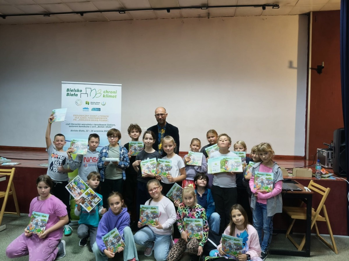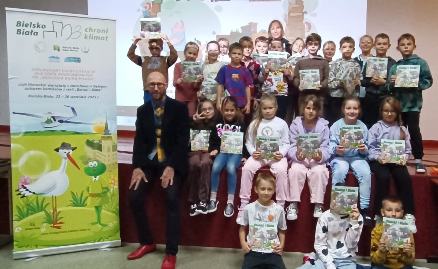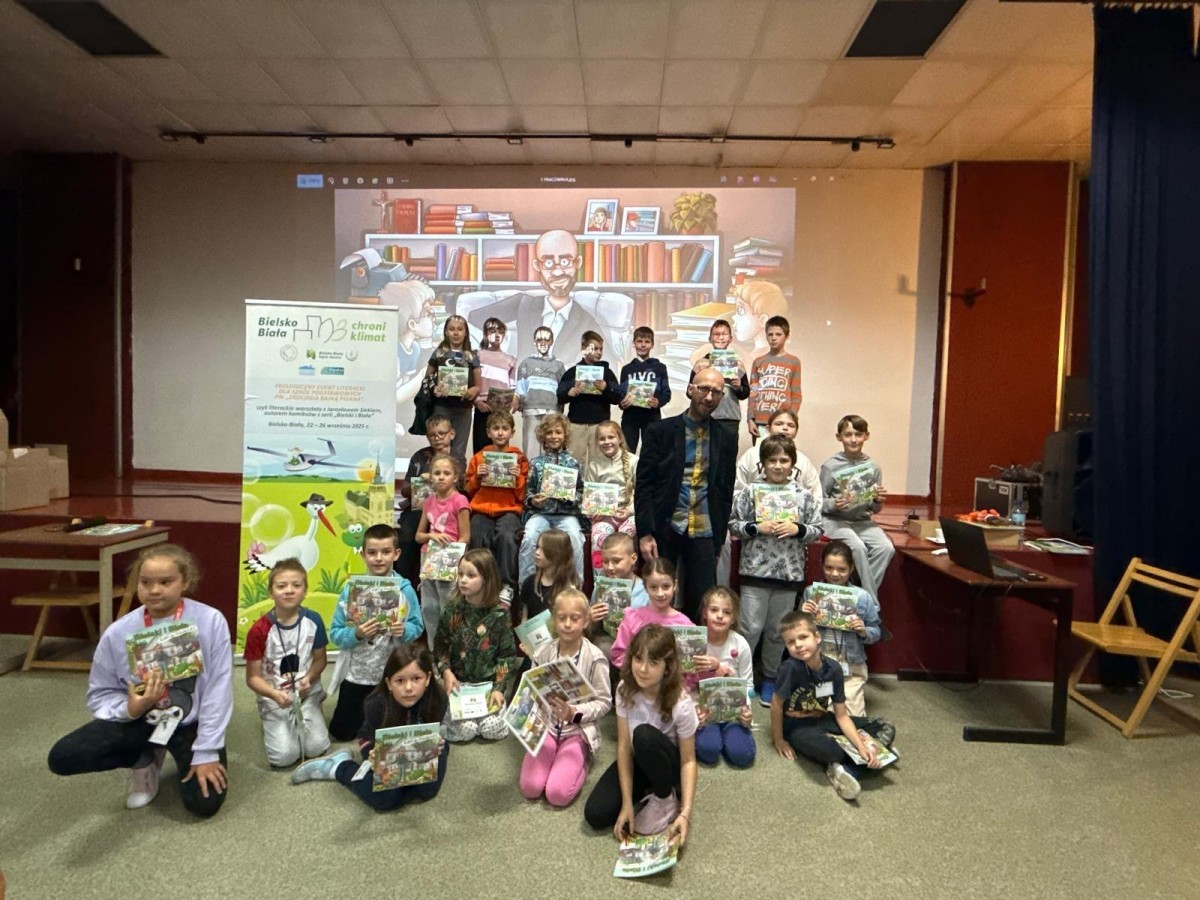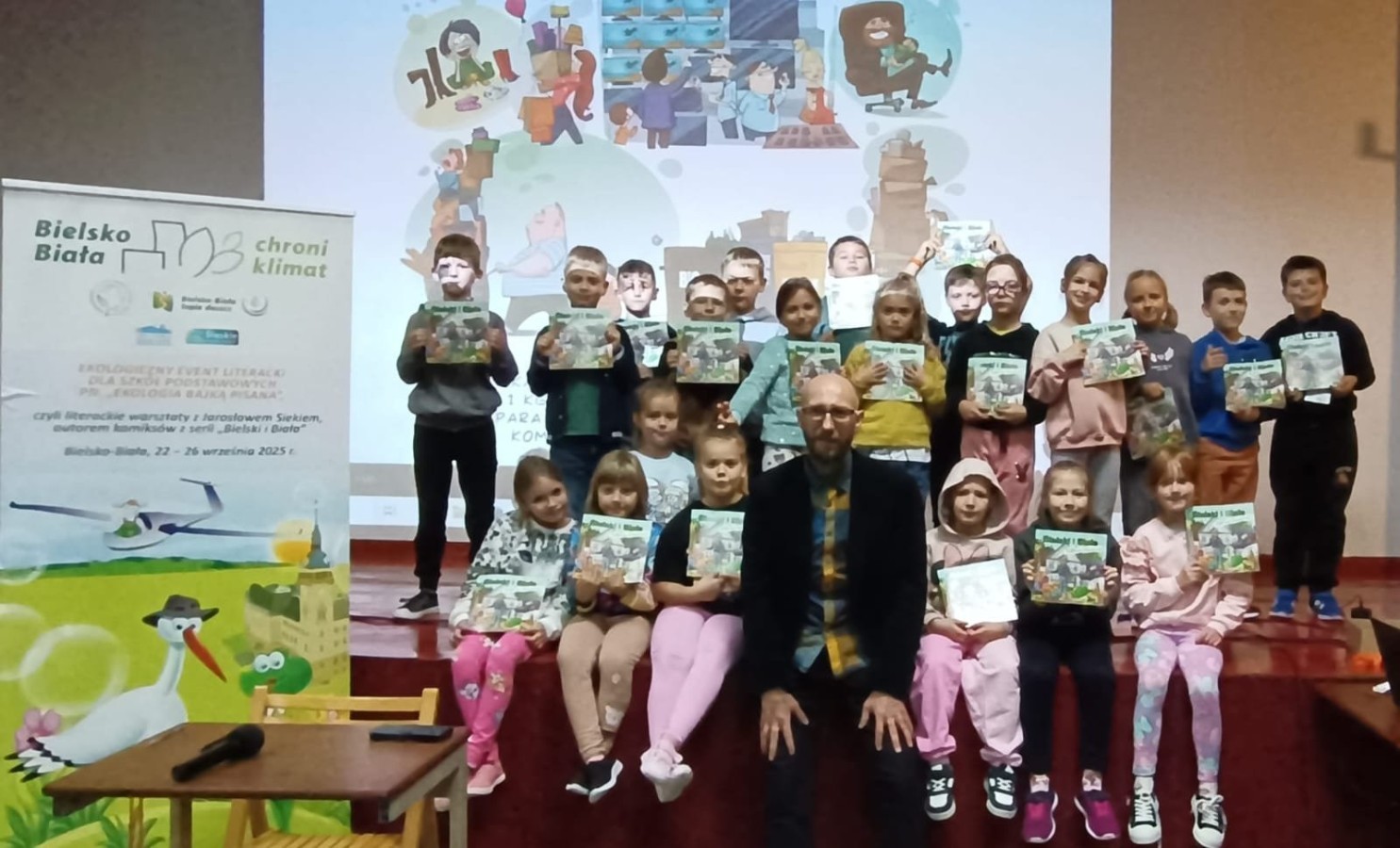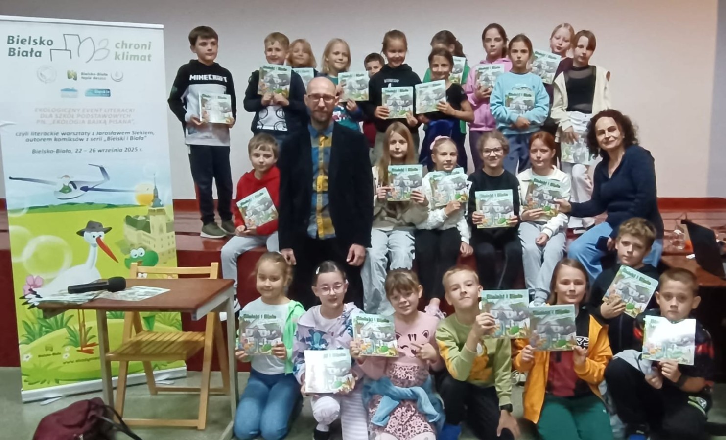 Pan Jarosław Siek, znany autor bajek i komiksów dla dzieci, a także twórca oryginalnych warsztatów literackich poprowadził spotkanie pełne humoru, opowieści oraz interaktywnych elementów: czytania fragmentów, rozmów o tym, jak powstaje książka, a także krótkich mini-warsztatów słownych. Spotkanie miało na celu rozbudzenie w dzieciach wrażliwości ekologicznej oraz inspirowanie ich do postaw proekologicznych — od ochrony środowiska po świadome i odpowiedzialne korzystanie z energii. Każde dziecko otrzymało egzemplarz „Bielski i Biała łapią oddech” z imiennym autografem autora — piękna pamiątka, która zostanie z nimi na długo.