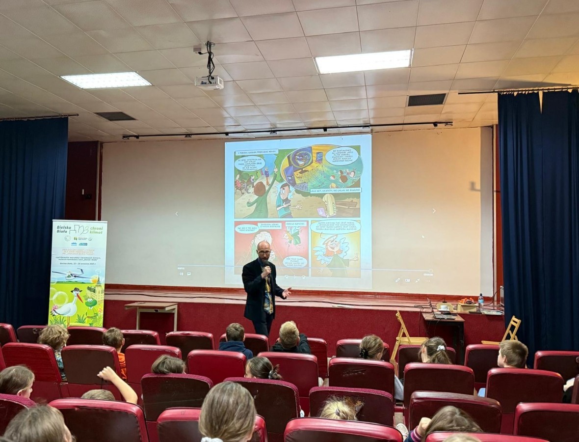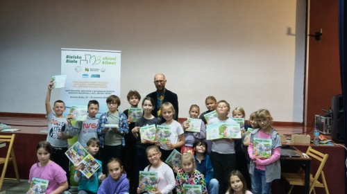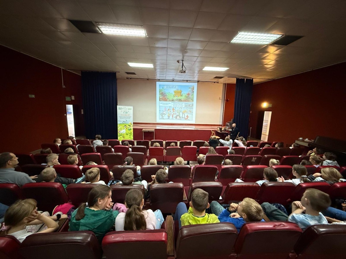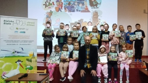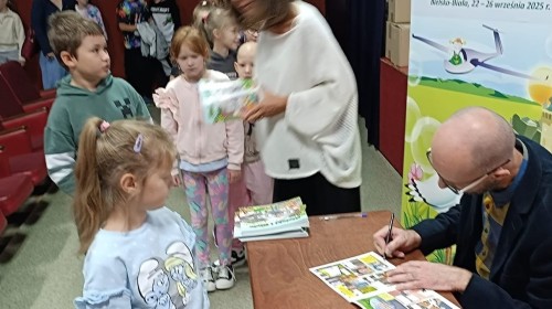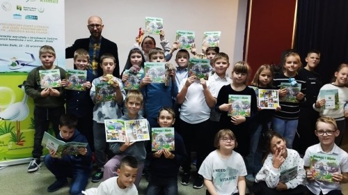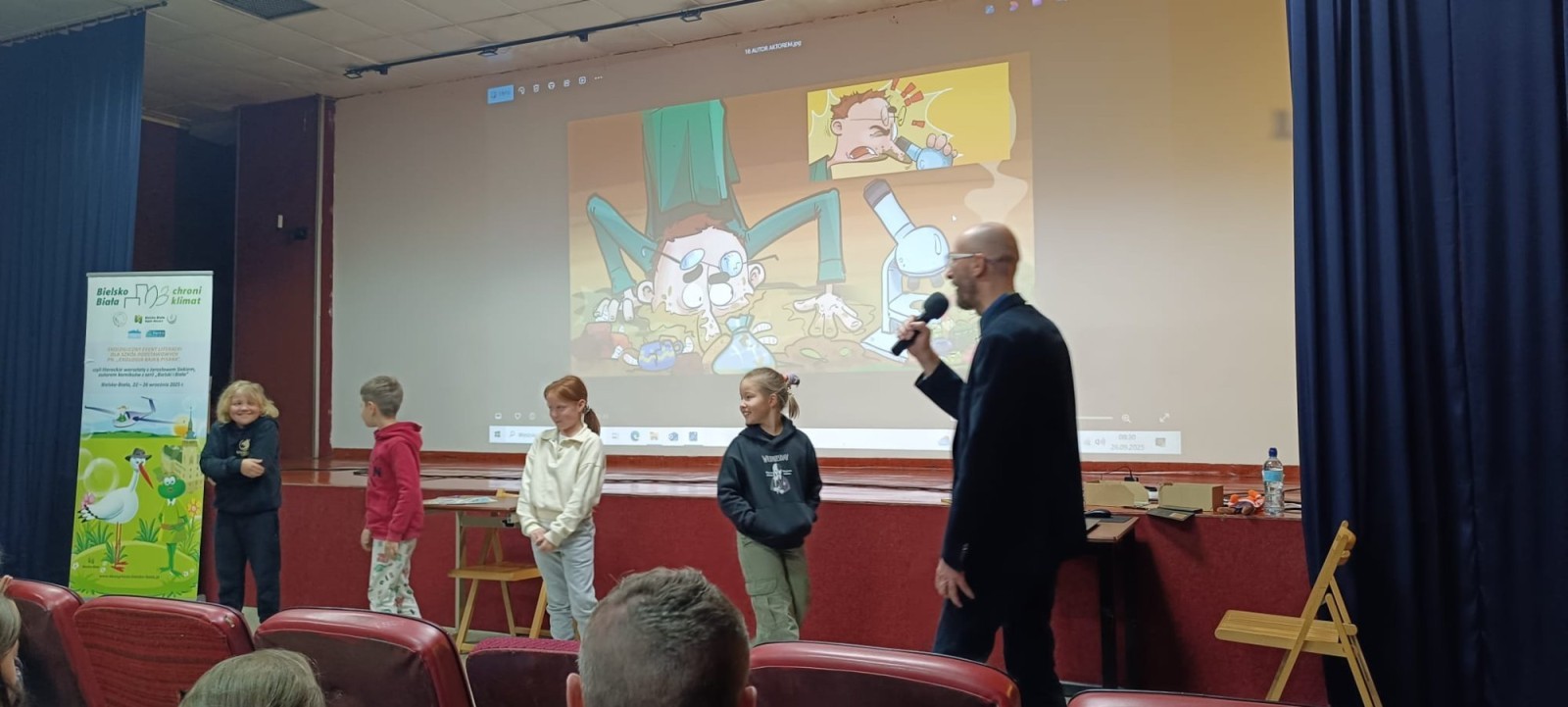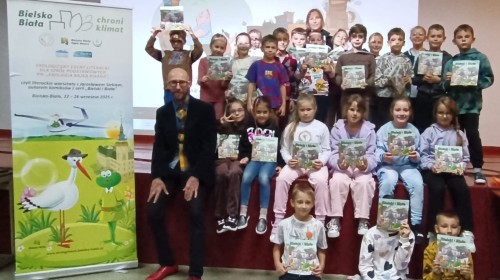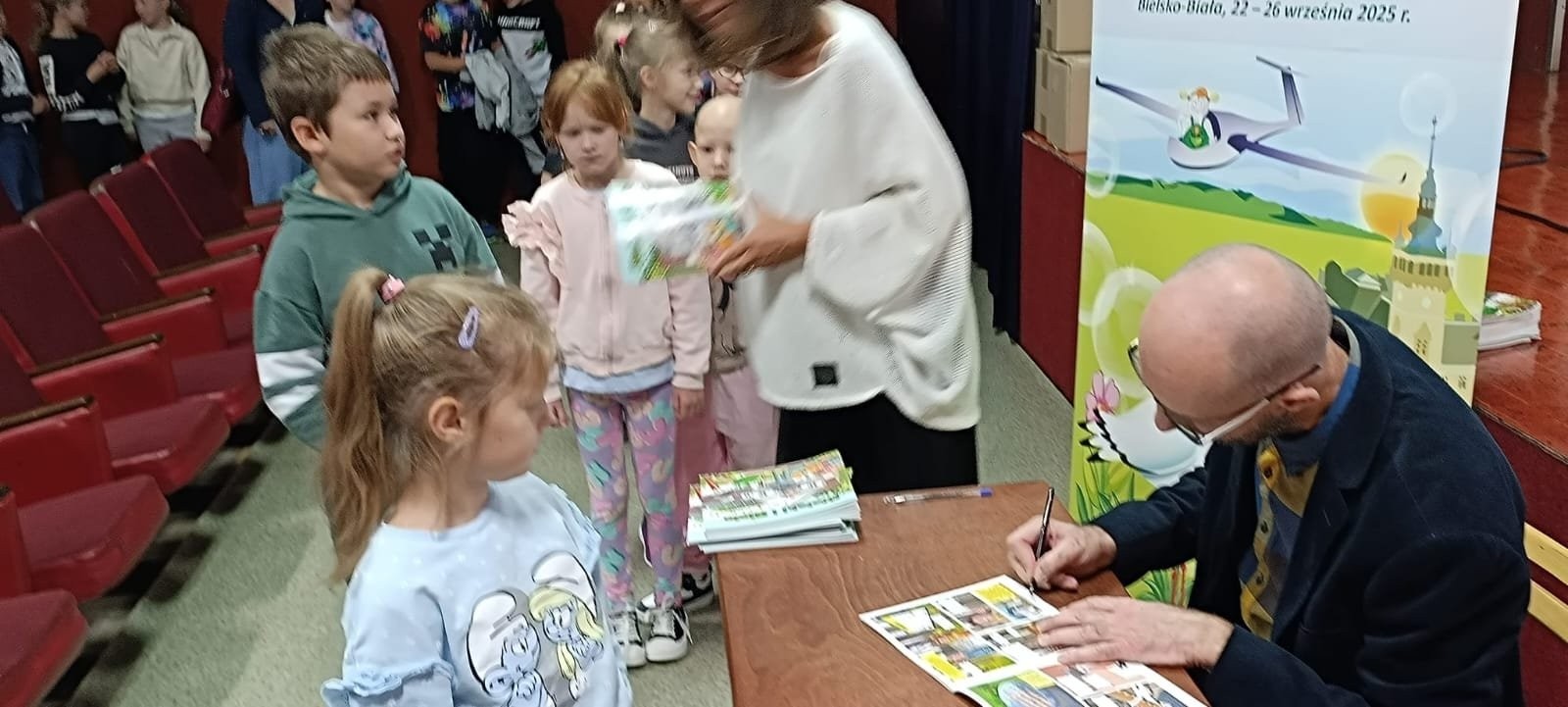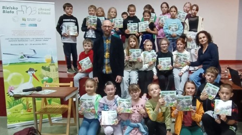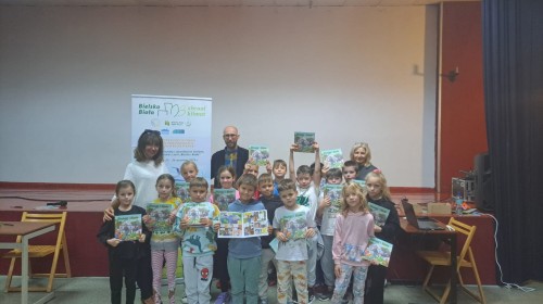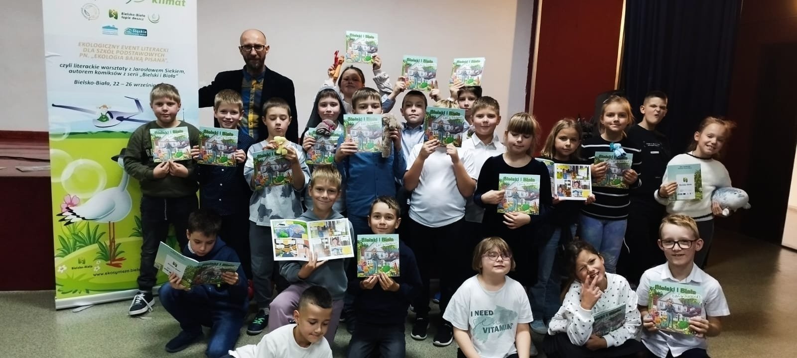 Pan Jarosław Siek, znany autor bajek i komiksów dla dzieci, a także twórca oryginalnych warsztatów literackich poprowadził spotkanie pełne humoru, opowieści oraz interaktywnych elementów: czytania fragmentów, rozmów o tym, jak powstaje książka, a także krótkich mini-warsztatów słownych. Spotkanie miało na celu rozbudzenie w dzieciach wrażliwości ekologicznej oraz inspirowanie ich do postaw proekologicznych — od ochrony środowiska po świadome i odpowiedzialne korzystanie z energii. Każde dziecko otrzymało egzemplarz „Bielski i Biała łapią oddech” z imiennym autografem autora — piękna pamiątka, która zostanie z nimi na długo.