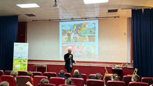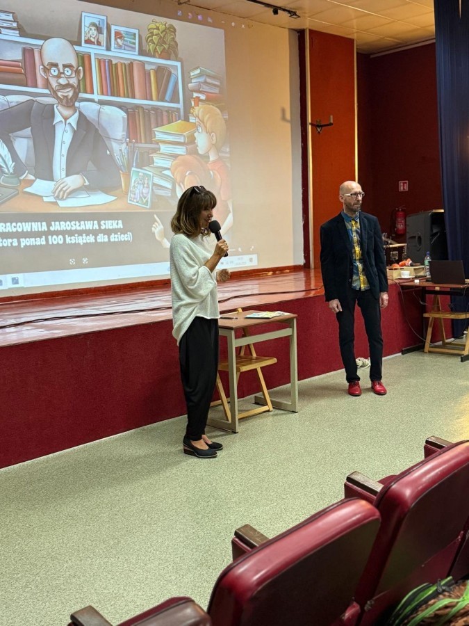 26 września w naszej szkole odbyło się wyjątkowe spotkanie autorskie z Panem Jarosławem Siekiem. Uczniowie klas II, III i IV – w sumie aż 12 oddziałów – mieli okazję uczestniczyć w inspirującym wydarzeniu, które zorganizowane zostało w ramach nagrody za wyróżnienie specjalne w zeszłorocznym konkursie „Szanuj Energię, Chroń Klimat".