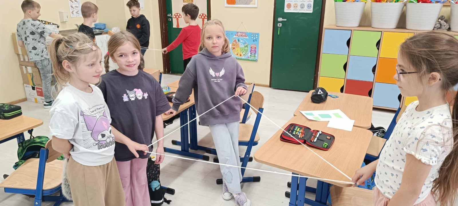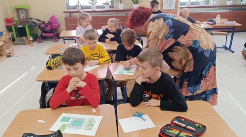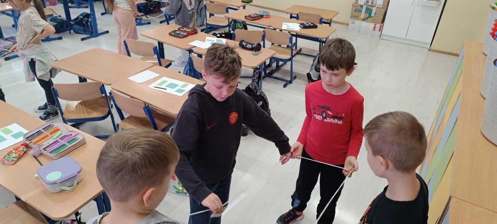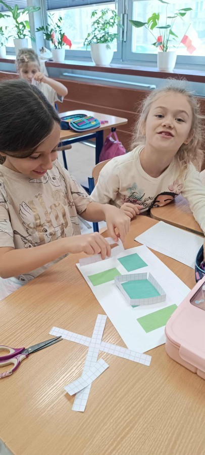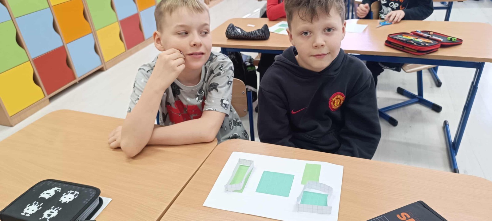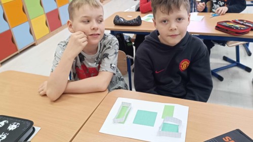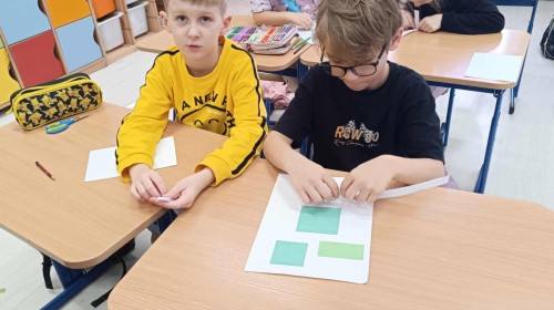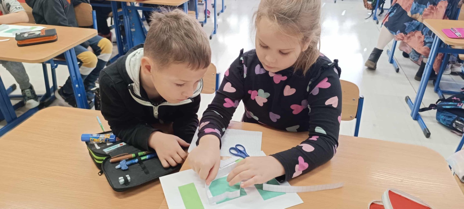 Podczas warsztatów uczniowie utrwalali nazwy podstawowych figur, wzbogacali swój język matematyczny, opisując ich cechy i kształty, a przede wszystkim – budowali pozytywny stosunek do matematyki dzięki różnorodnym grom i zabawom geometrycznym.