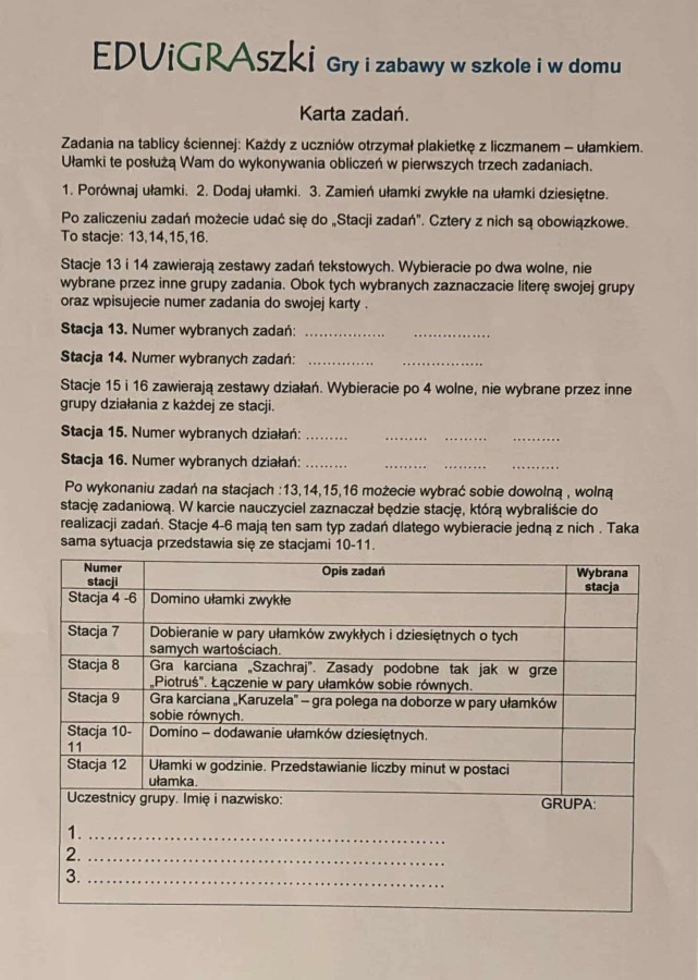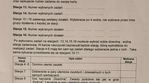Na zajęciach stosowana była praca w trzyosobowych grupach metodą myślącej klasy oraz zaprezentowane zostały gry i zabawy matematyczne (np. domino i inne) oraz stacje zadaniowe do rozwiązania. Cała klasa była bardzo aktywna, a bawiąc się, uczniowie pomagali sobie wzajemnie i rozwiązali wiele zadań. Taka forma pracy na lekcjach sprzyjała nauce w miłej atmosferze.