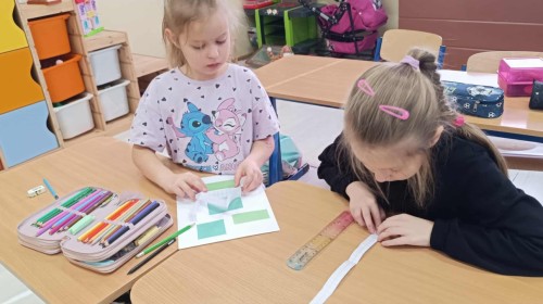 W klasie 2d pani Jola przeprowadziła wyjątkowe warsztaty „W krainie geometrii”. Zajęcia miały na celu rozwijanie intuicji geometrycznej uczniów oraz wprowadzanie podstawowych pojęć związanych z własnościami figur płaskich. Dzieci odkrywały świat geometrii poprzez obserwację, manipulację, działanie i zabawę, co pozwoliło im w naturalny sposób rozpoznawać, nazywać i porównywać figury geometryczne obecne w otaczającym świecie.