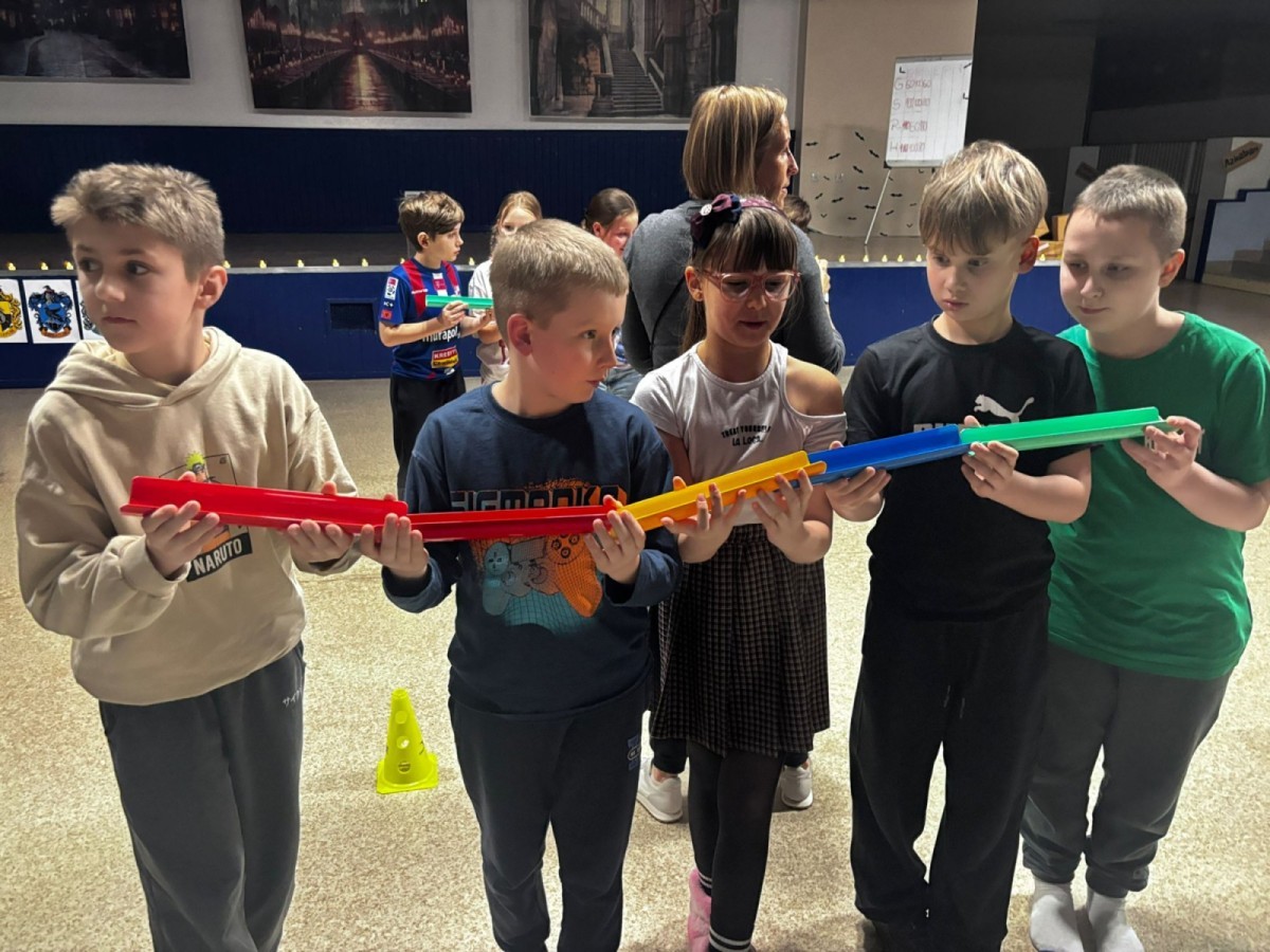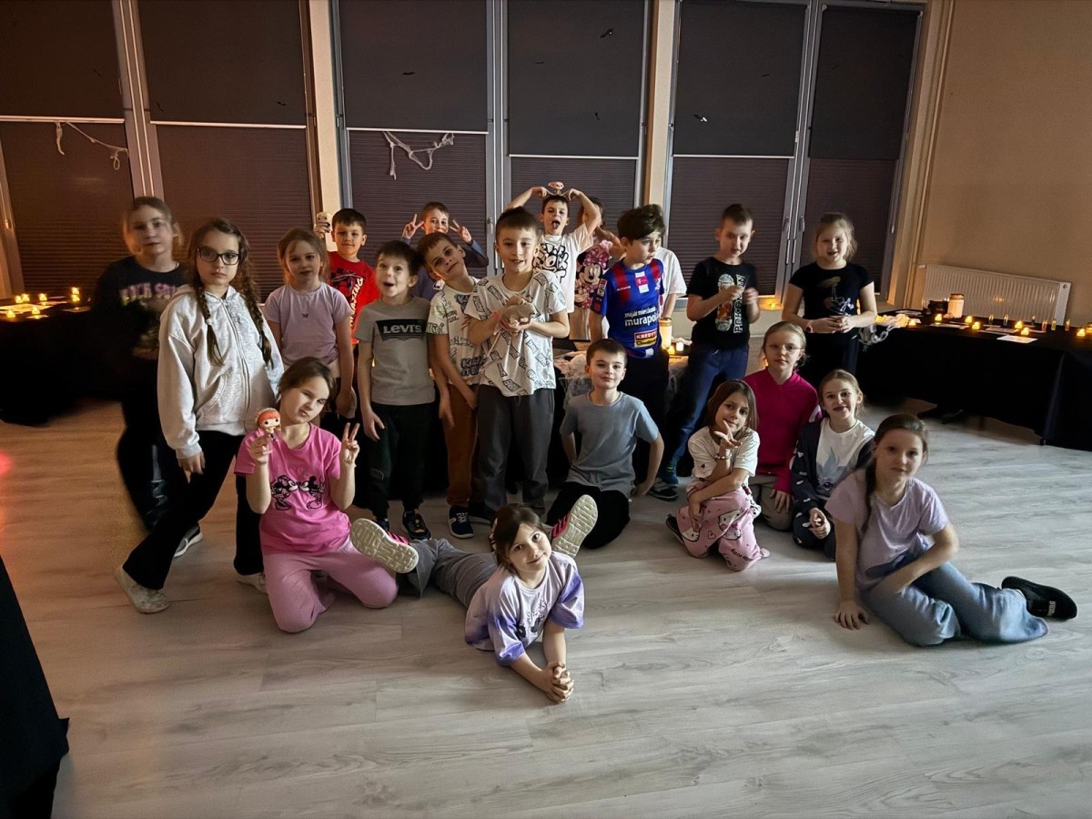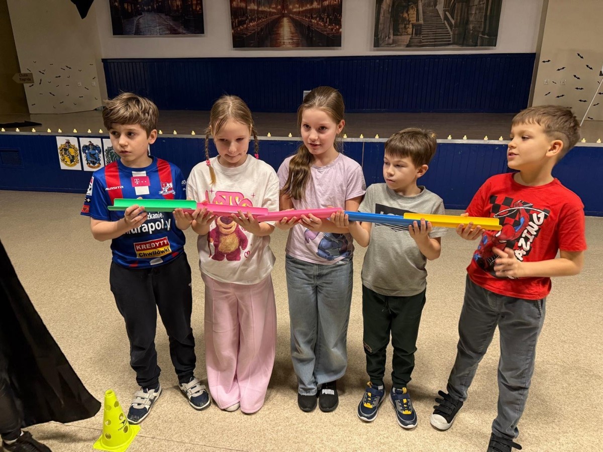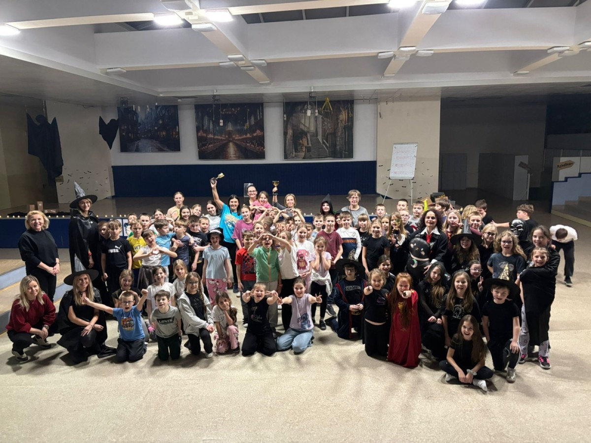 Na uczestników czekało wiele atrakcji, m.in. sportowy Turniej Trójmagiczny oraz pełen zagadek magiczny escape room. Dużym zainteresowaniem cieszyła się także fotobudka, w której dzieci mogły wykonać pamiątkowe zdjęcia. Jednym z najbardziej emocjonujących punktów programu były podchody „Zaginione Zaklęcia Hogwartu”. Uczniowie, wyposażeni w latarki, przemierzali zaciemnione szkolne korytarze, rozwiązując kolejne zadania i odkrywając tajemnice ukryte w różnych zakątkach budynku. Nie zabrakło również piżama party oraz wspólnych zabaw z animatorem, które dostarczyły mnóstwo radości i pozwoliły spożytkować niespożytą energię.