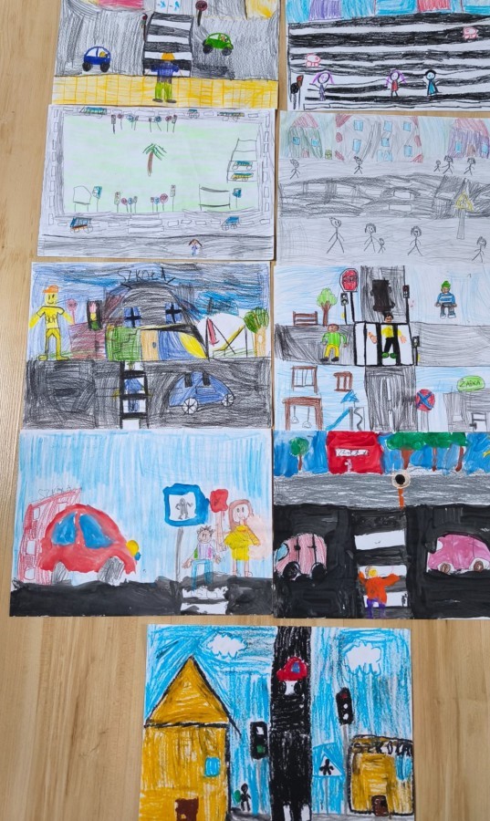 Dzieci z klas I wykazały się niezwykłą pomysłowością i wiedzą na temat bezpieczeństwa. W swoich pracach przedstawiły m.in. prawidłowe przechodzenie przez jezdnię, znaczenie noszenia odblasków oraz właściwe zachowanie na przejściach dla pieszych.