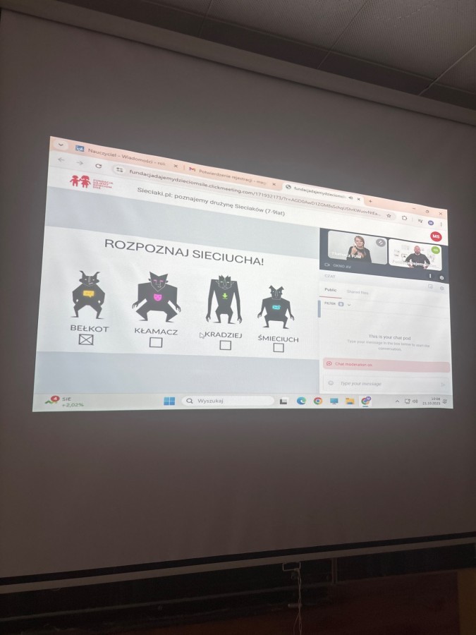 W naszej szkole odbyła się konferencja edukacyjna zorganizowana przez Fundację „ Dajemy dzieciom siłę” pod hasłem „Sieciaki na tropie bezpieczeństwa w sieci”, której celem było uświadomienie uczniom, jak ważne jest odpowiedzialne i bezpieczne korzystanie z internetu.