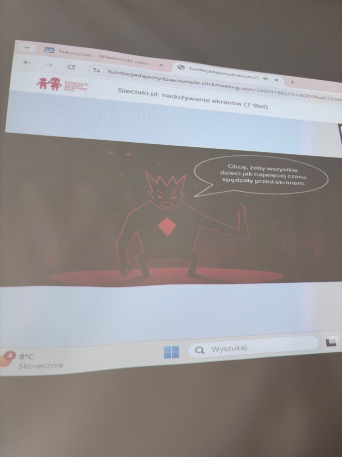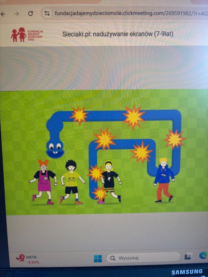 Podczas kolejnego spotkania w ramach programu Sieciaki.pl uczniowie uczestniczyli w zajęciach poświęconych tematyce nadużywania ekranów. Dzieci dowiedziały się, jakie mogą być negatywne skutki spędzania zbyt dużej ilości czasu przed komputerem, tabletem czy telefonem, takie jak zmęczenie wzroku, brak ruchu, rozdrażnienie czy trudności z koncentracją.