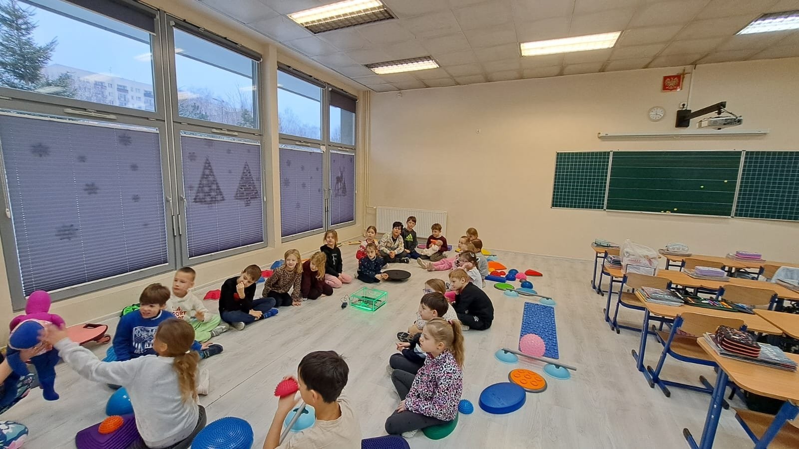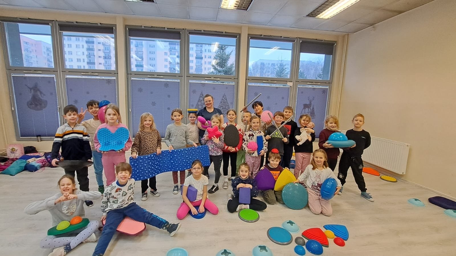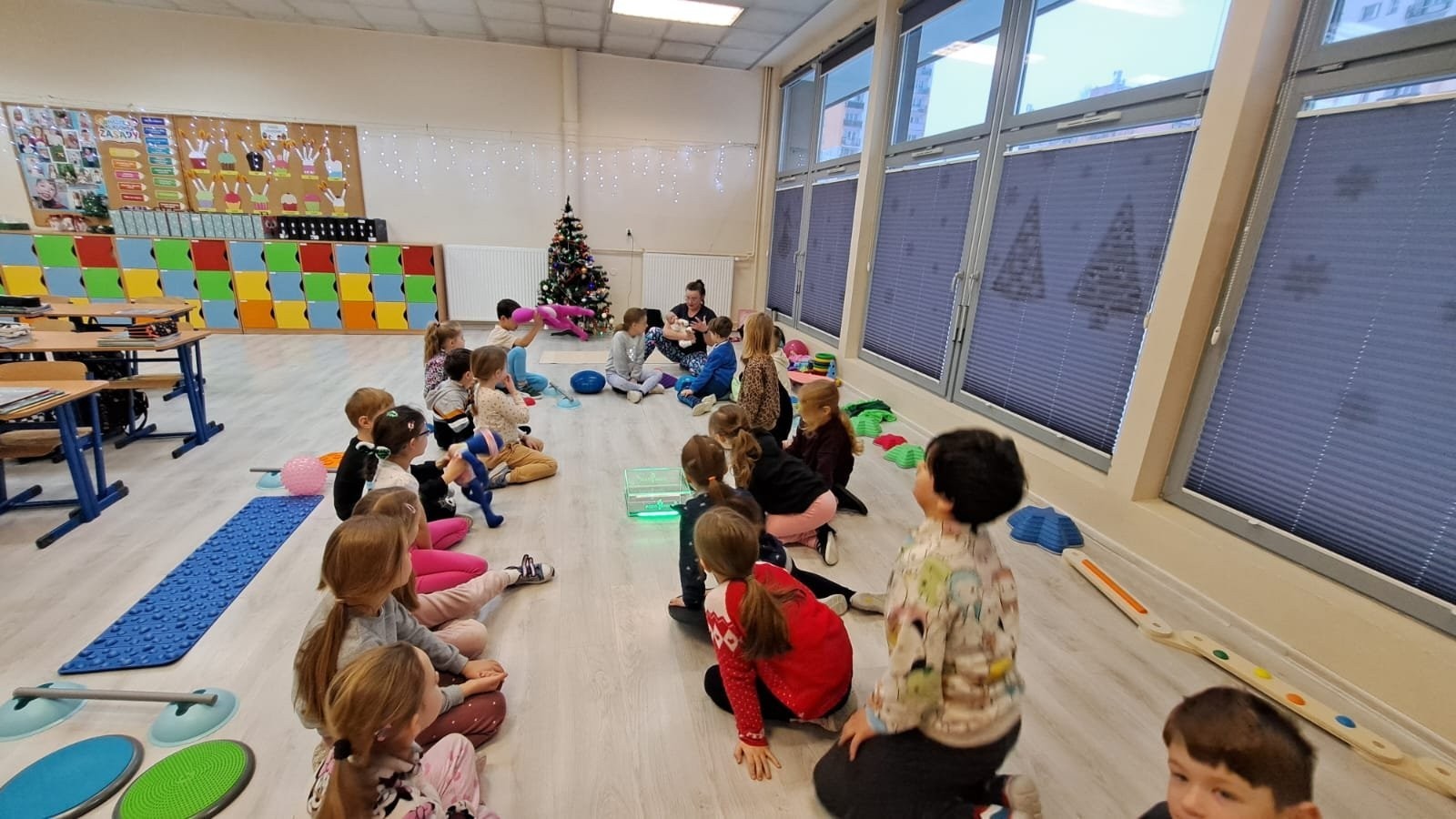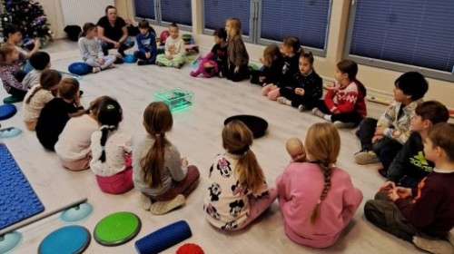 Klasa 1c realizuje w tym roku program autorski „Fitness Dance”, który łączy ruch, muzykę i świadome dbanie o zdrowie. Właśnie dlatego postanowiliśmy zaprosić do naszej klasy wyjątkowego gościa – panią Anię, mamę Julci, a na co dzień fizjoterapeutkę dziecięcą oraz terapeutkę integracji sensorycznej.