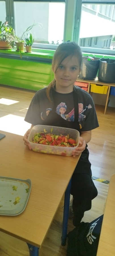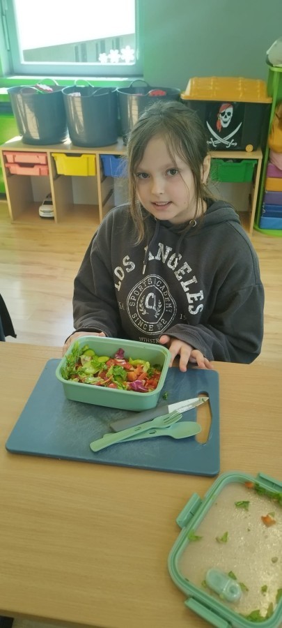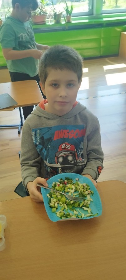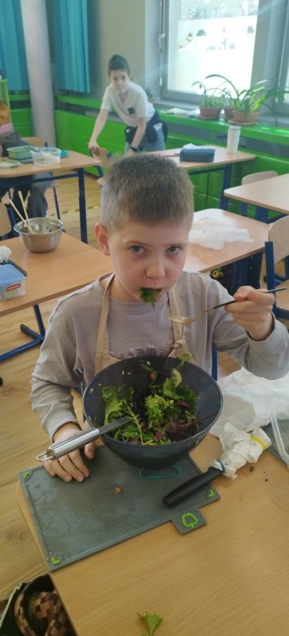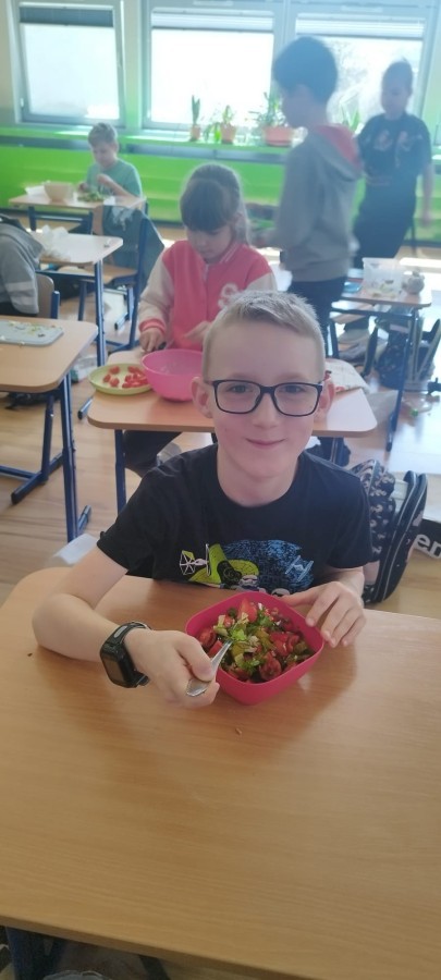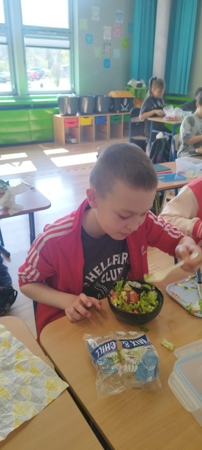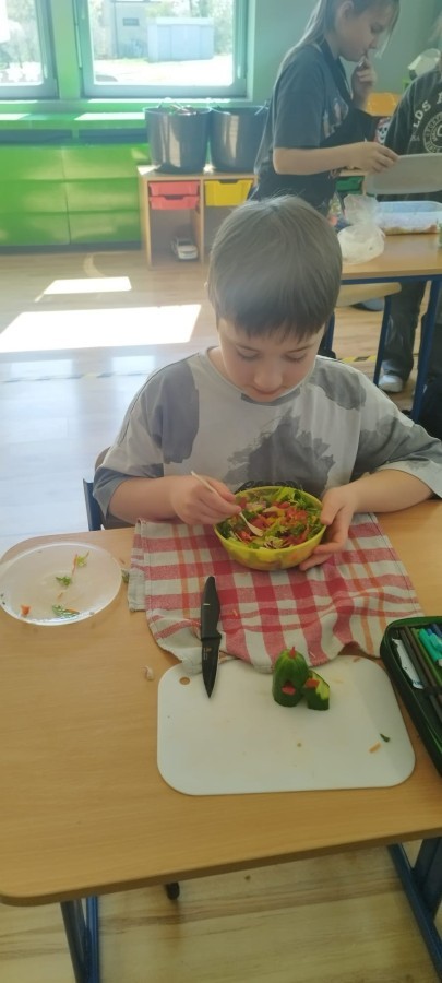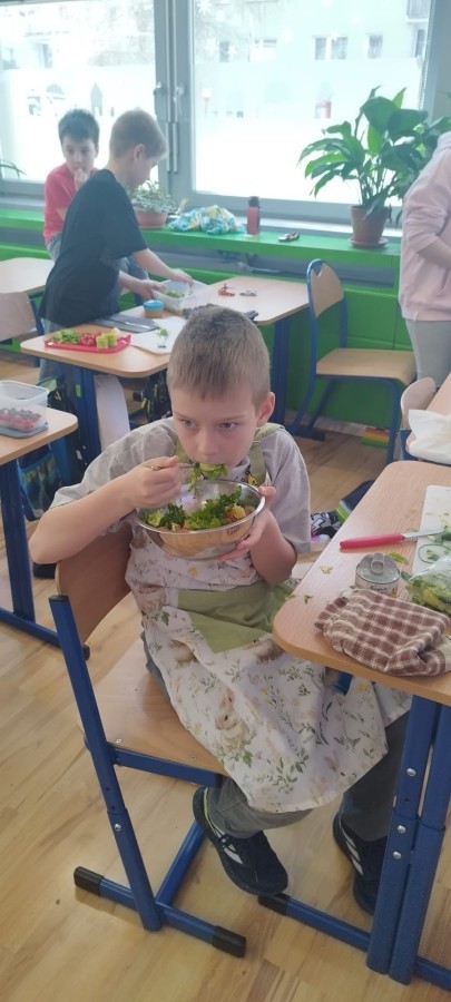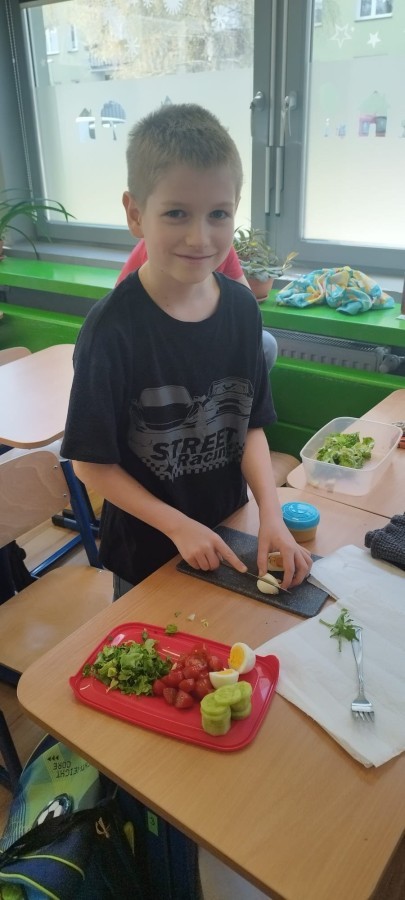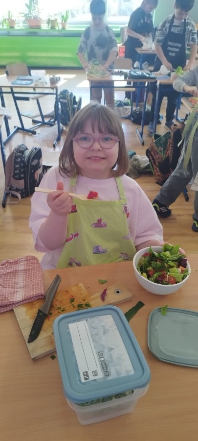 W dniu 10 kwietnia uczniowie klasy 3c spotkali się z Panią Anną Kubowicz pracującą jako dietetyk kliniczny. Podczas spotkania uczniowie poznali podstawowe zasady zdrowego żywienia oraz dowiedzieli się, jak ważną rolę odgrywa odpowiednio zbilansowana dieta w codziennym życiu. Specjalistka przedstawiła najważniejsze składniki pokarmowe niezbędne do prawidłowego funkcjonowania organizmu, takie jak białka, tłuszcze, węglowodany, witaminy i składniki mineralne, a także omówiła ich źródła i znaczenie dla zdrowia. W trakcie zajęć uczestnicy mieli okazję porozmawiać o swoich nawykach żywieniowych oraz dowiedzieć się, jak wprowadzać zdrowe wybory do codziennej diety. Część praktyczna objęła przygotowanie sałatki wiosennej z wykorzystaniem świeżych warzyw, oliwy z oliwek i nasion słonecznika co pozwoliło utrwalić wiedzę w praktyce. Dodatkowo przypomniane zostały zasady bezpiecznego posługiwania się nożem oraz higieny podczas przygotowywania posiłków. Spotkanie miało na celu kształtowanie zdrowych nawyków oraz rozwijanie umiejętności kulinarnych.