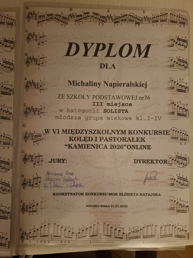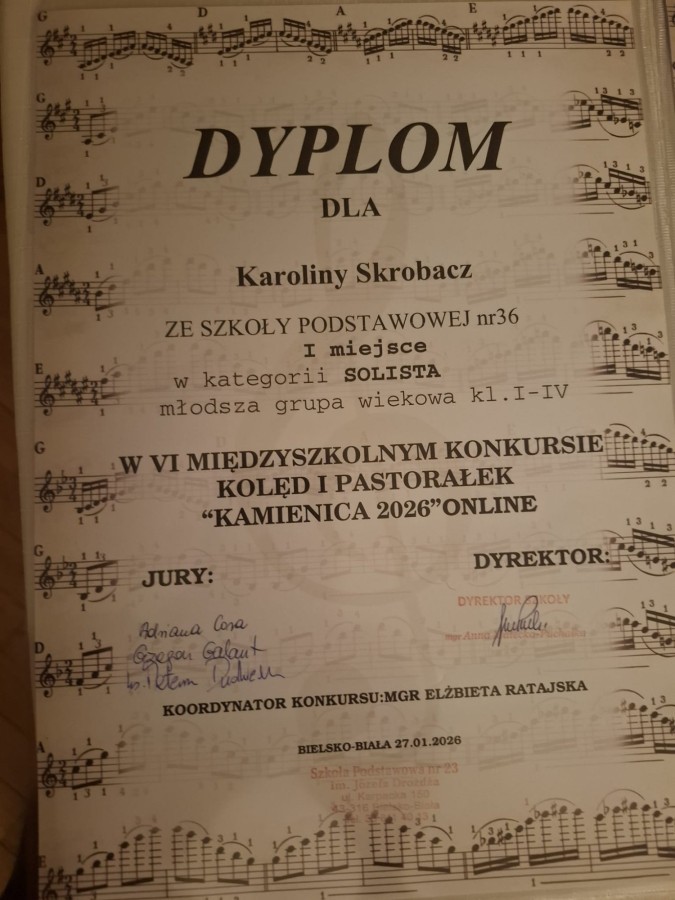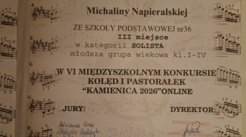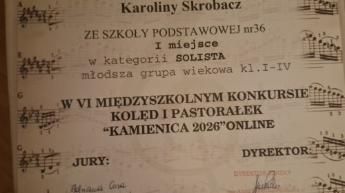 Uczennice naszej szkoły zostały zaproszone, po wstępnych eliminacjach, do udziału w koncercie laureatów VI Konkursu Kolęd i Pastorałek Kamienica 2026 ONLINE.
