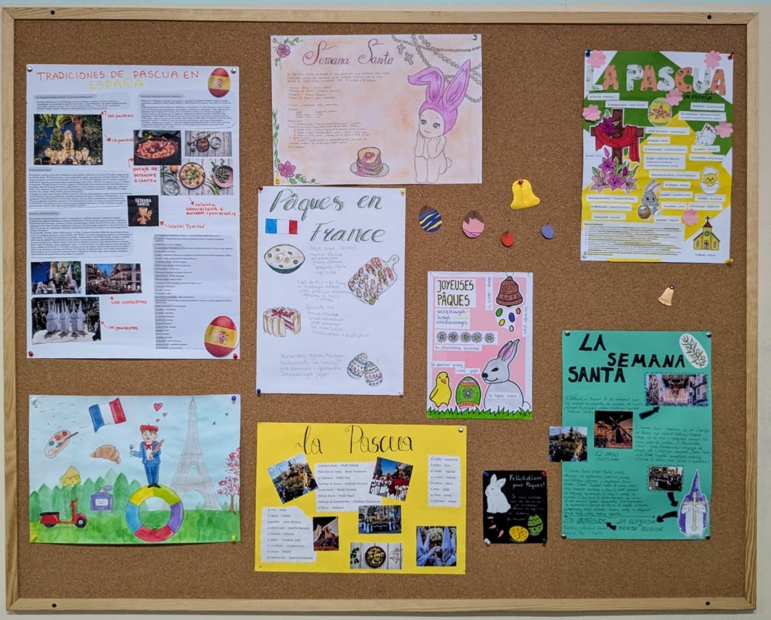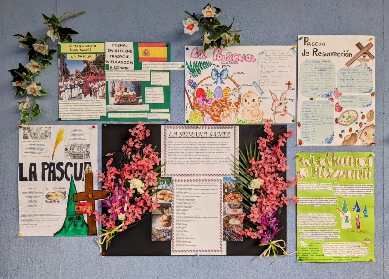 Na korytarzach szkoły zrobiło się wiosennie. Uczniowie Szkoły Podstawowej oraz Liceum wykonali projekty, które można zobaczyć na gazetce: wiersze o tematyce wiosennej oraz plakaty przedstawiające tradycje wielkanocne we Francji i w Hiszpanii.