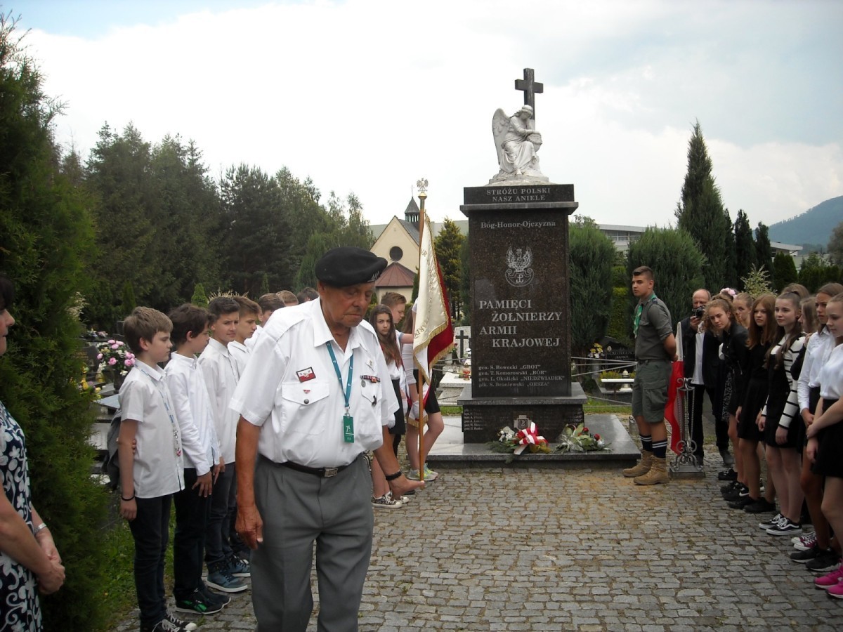 Kapitan Dąmbrowski z młodzieżą przy pomniku Armii Krajowej w Olszówce