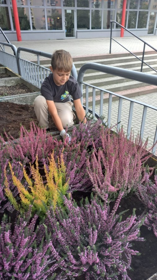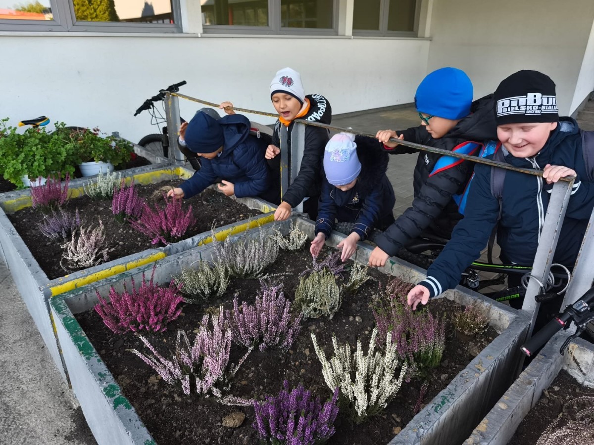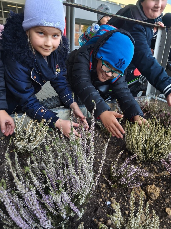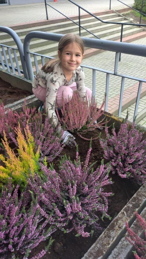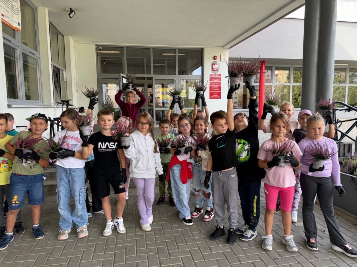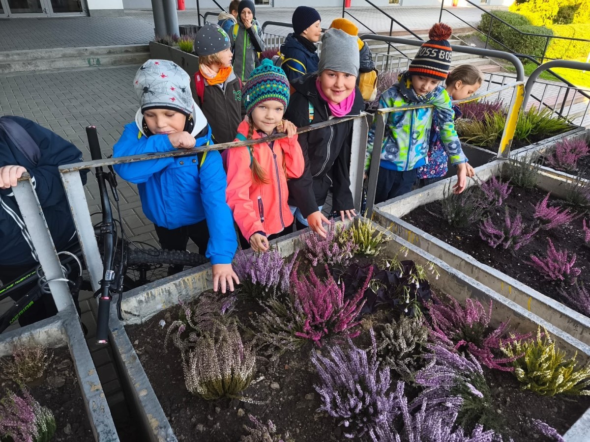 W październiku uczniowie klas 1a, 1b, 1c, 2c oraz – z ogromnym entuzjazmem – także klasy 4d podjęli wspólną inicjatywę i założyli przed szkołą piękny ogród wrzosów w ozdobnych donicach. Dzięki ich zaangażowaniu przestrzeń przed budynkiem zyskała nowy, barwny wygląd, a cała społeczność szkolna może cieszyć się wyjątkową, jesienną atmosferą.