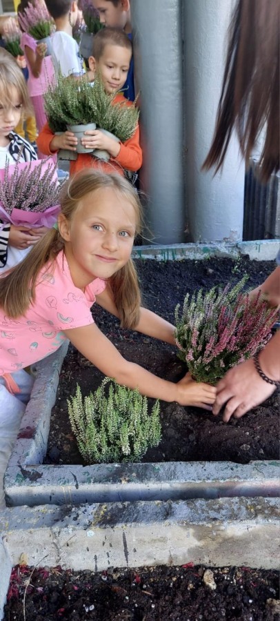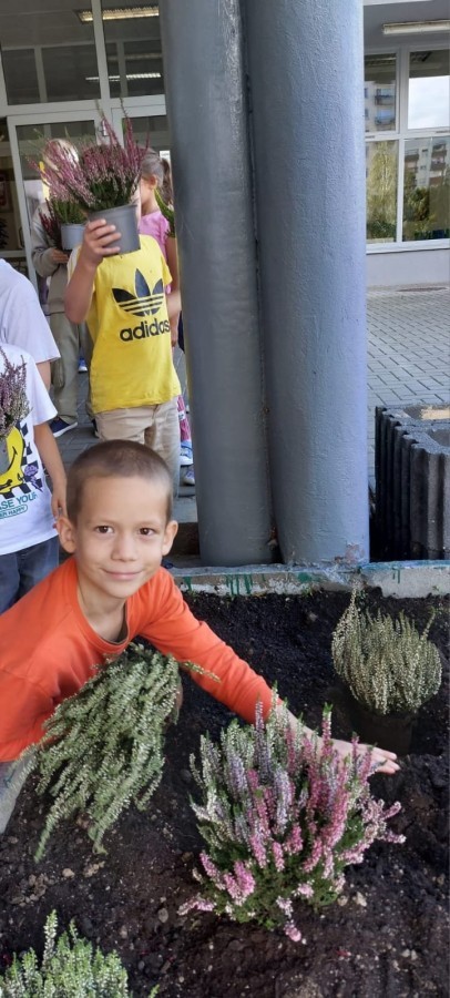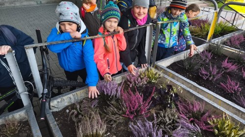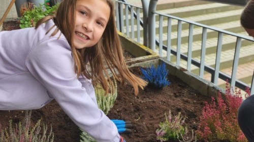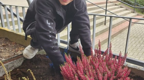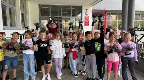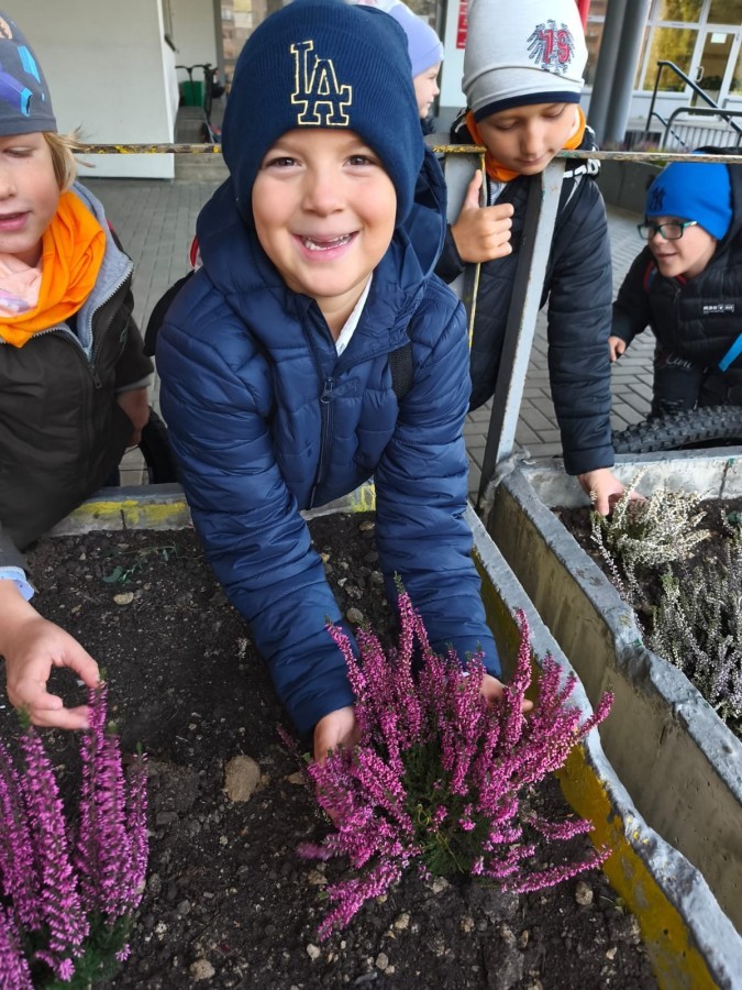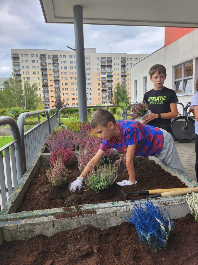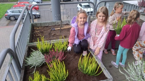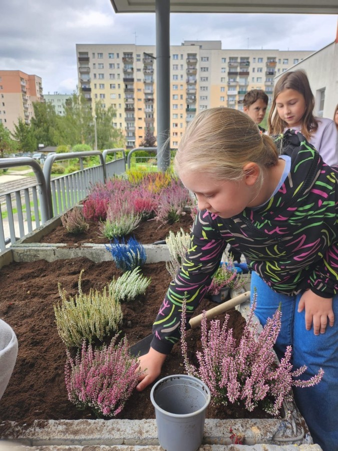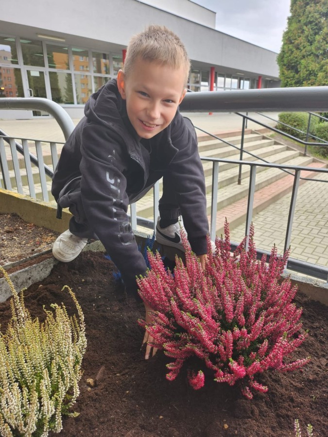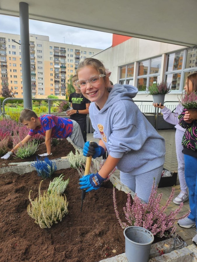 W październiku uczniowie klas 1a, 1b, 1c, 2c oraz – z ogromnym entuzjazmem – także klasy 4d podjęli wspólną inicjatywę i założyli przed szkołą piękny ogród wrzosów w ozdobnych donicach. Dzięki ich zaangażowaniu przestrzeń przed budynkiem zyskała nowy, barwny wygląd, a cała społeczność szkolna może cieszyć się wyjątkową, jesienną atmosferą.