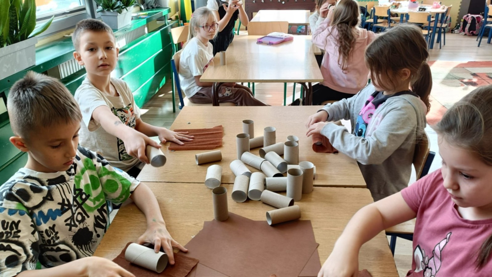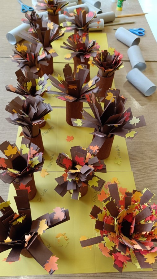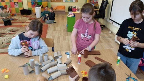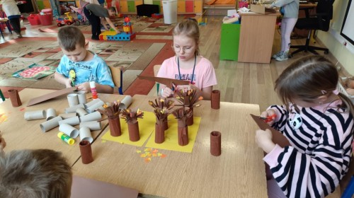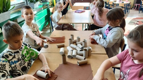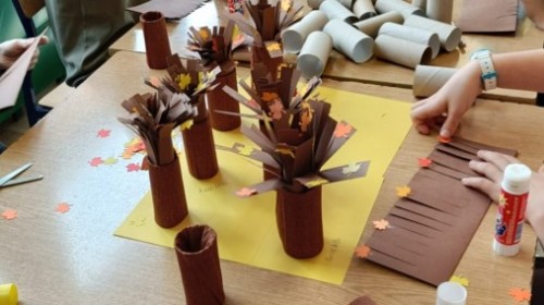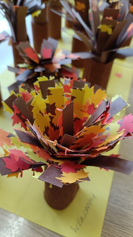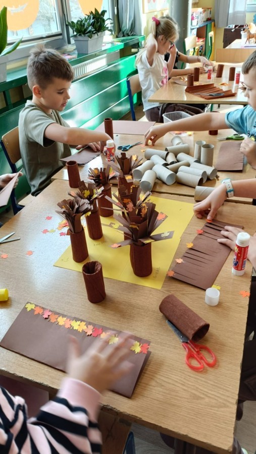 Pamiętając o ochronie przyrody oraz znaczeniu recyklingu, dzieci ze świetlicy wykonały piękne prace przedstawiające jesienne drzewa. Nadały drugie życie rolkom po papierze toaletowym, wykorzystując również skrawki kolorowego papieru. Kreatywne i twórcze działanie po raz kolejny zostało zrealizowane z dużym zaangażowaniem i pomysłowością.