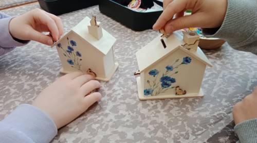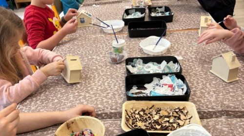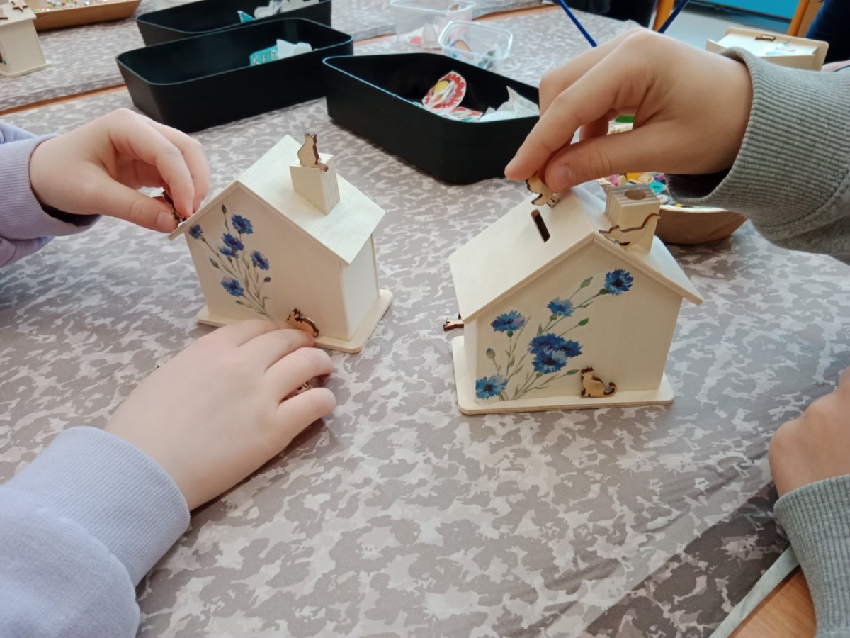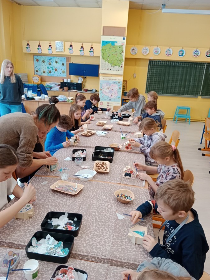 Jednym z zajęć pierwszego dnia zimowiska były zajęcia z Ekooprzystankiem, podczas których dzieci wzięły udział w kreatywnych warsztatach ekologicznych. Uczestnicy własnoręcznie wykonywali ekologiczne, drewniane skarbonki, ucząc się jednocześnie, jak poprzez twórcze działania można dawać drugie życie naturalnym materiałom. Zajęcia te były nie tylko okazją do rozwijania wyobraźni i zdolności manualnych, ale również do rozmowy o odpowiedzialnym korzystaniu z zasobów i trosce o środowisko.