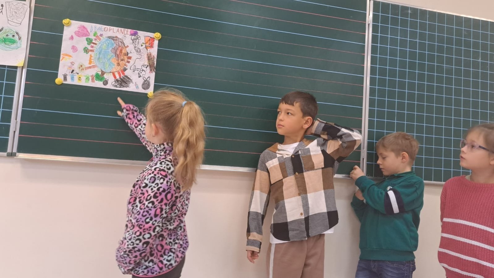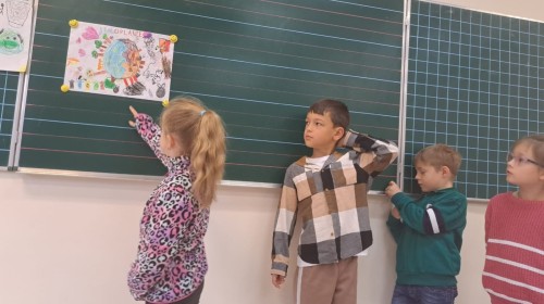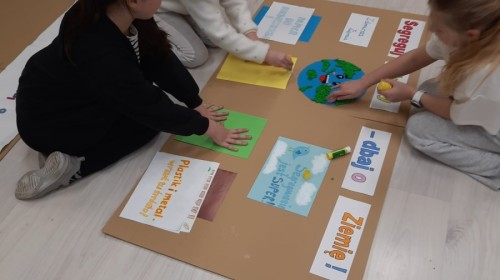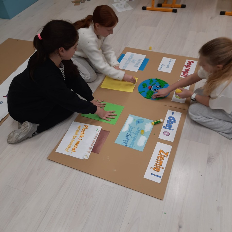 W ramach działania twórczego powstały również plakaty edukacyjne nawiązujące do hasła „Daj nową energię – jak dbam o planetę Ziemię”. Praca miała charakter grupowy – dzieci wspólnie zastanawiały się, w jaki sposób można dbać o naszą planetę, wymieniały się pomysłami i nawzajem uczyły odpowiedzialnych postaw wobec środowiska.