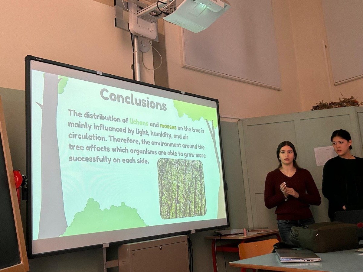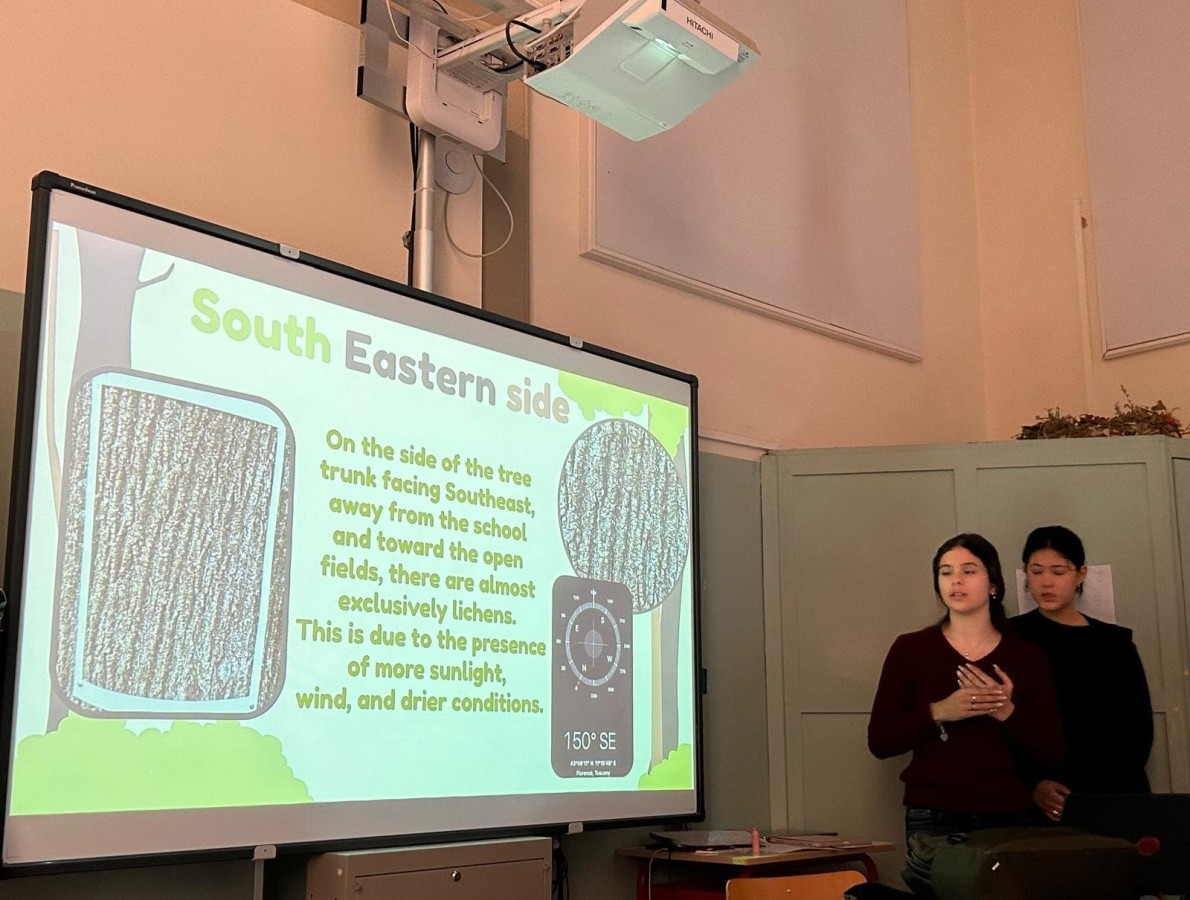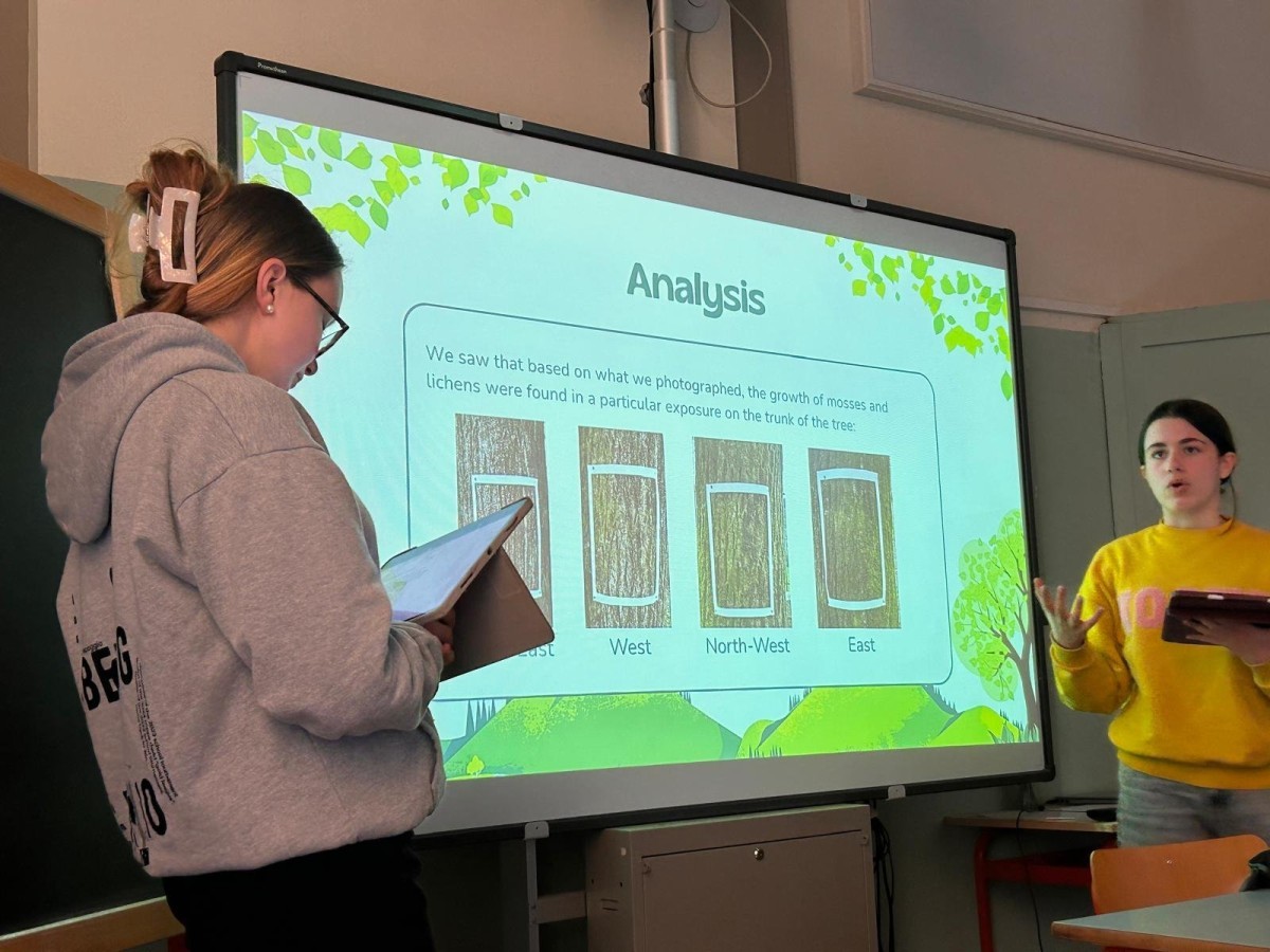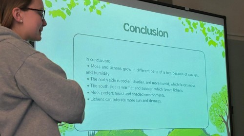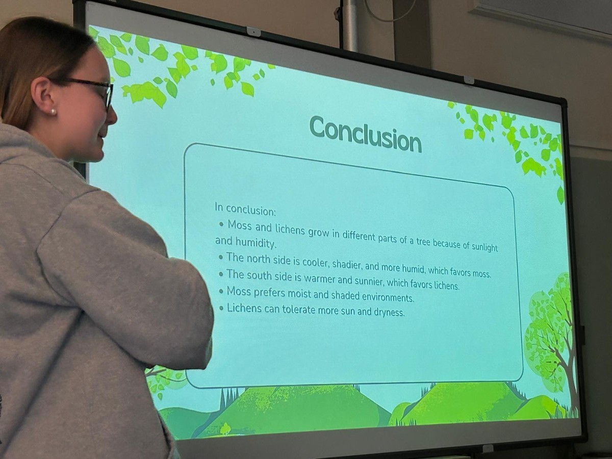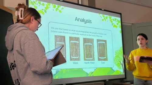 Kolejną obserwowaną lekcją była przyroda w klasie czwartej. Uczniowie przedstawiali prezentacje w języku angielskim podsumowujące projekt realizowany w poprzednim tygodniu. Dotyczył on obserwacji drzew rosnących przed szkołą, a także występujących na nich mchów i porostów. Uczniowie analizowali również warunki przyrodnicze oraz kierunki świata, które wpływają na wzrost i rozwój tych organizmów.
