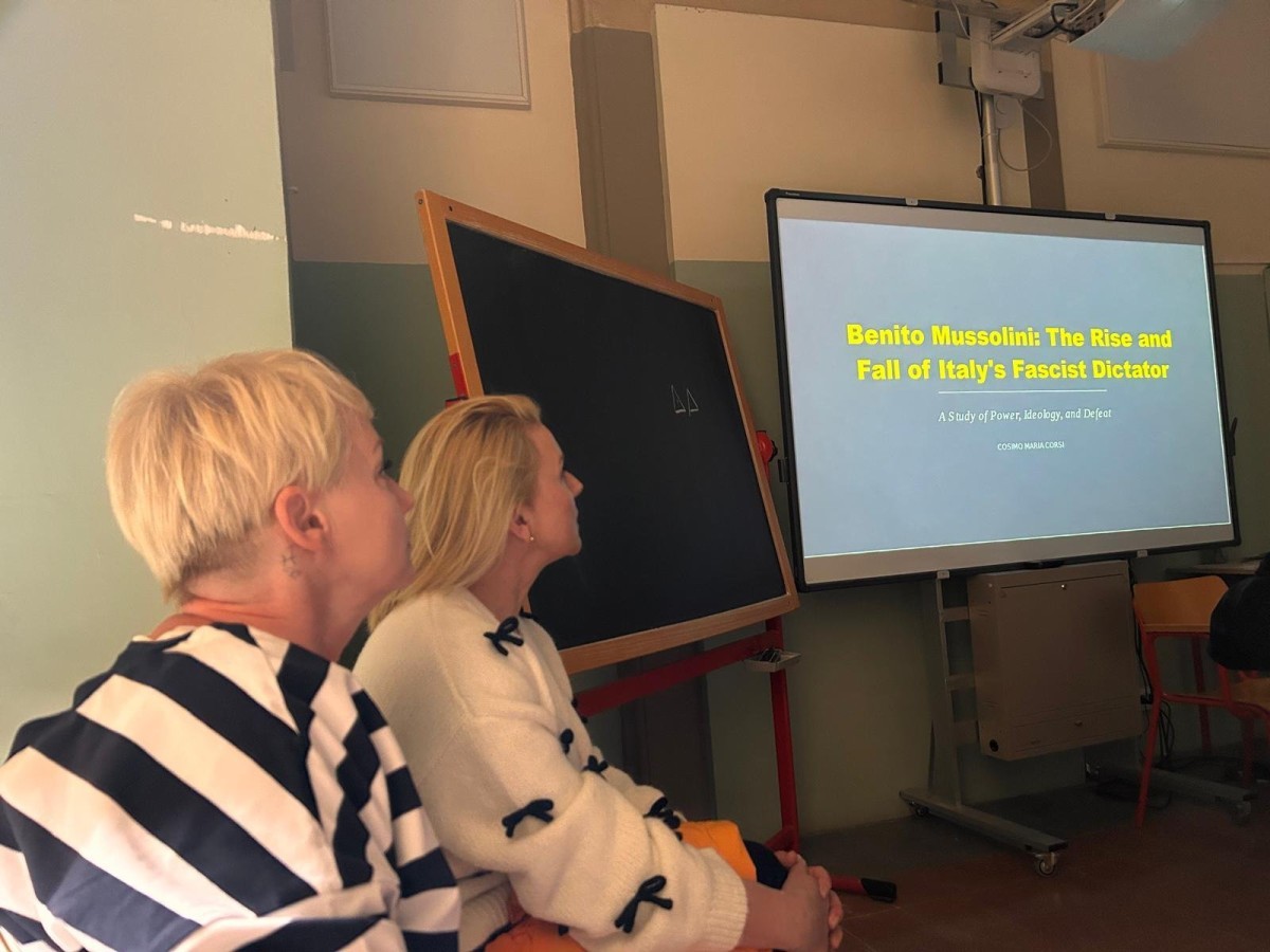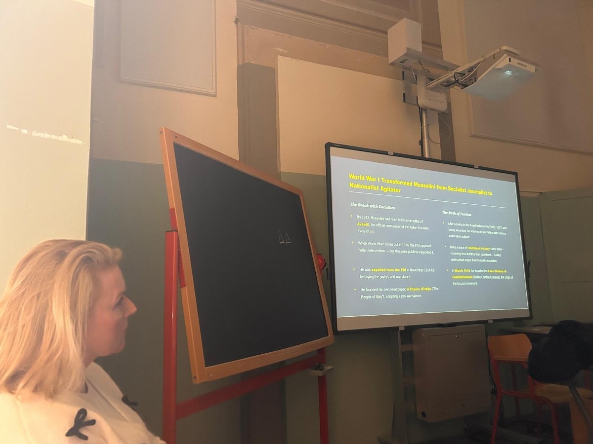 Podczas pierwszych zajęć, oprócz nauczyciela prowadzącego, obecny był również nauczyciel native speaker, który czuwał nad poprawnością językową wypowiedzi uczniów. Lekcja była częścią długoterminowego projektu realizowanego przez uczniów, dotyczącego ważnych postaci historycznych. W ramach projektu uczniowie samodzielnie wyszukują informacje, przygotowują prezentacje, a następnie przedstawiają je na forum klasy. Tego dnia prezentacja dotyczyła postaci Benito Mussoliniego, natomiast w poprzednim tygodniu uczniowie prezentowali materiał o Donaldzie Trumpie.