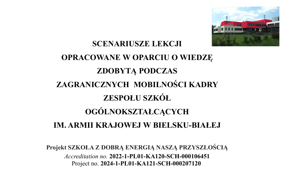 W ramach realizacji projektu „Szkoła z dobrą energią naszą przyszłością” kadra pedagogiczna Zespołu Szkół Ogólnokształcących im. Armii Krajowej w Bielsku-Białej uczestniczyła w zagranicznych mobilnościach edukacyjnych, podczas których zdobyła nowe doświadczenia, umiejętności i inspiracje do pracy z uczniami. Efektem tych działań są scenariusze lekcji opracowane w oparciu o wiedzę i dobre praktyki poznane za granicą. Zawierają one nowoczesne metody nauczania, elementy edukacji ekologicznej oraz działania promujące zrównoważony rozwój i świadome korzystanie z energii – zgodnie z ideą projektu. Publikacja scenariuszy stanowi przykład praktycznego wykorzystania rezultatów mobilności w codziennej pracy szkoły, a także przyczynia się do podnoszenia jakości nauczania i wzmacniania europejskiego wymiaru edukacji w naszej placówce.