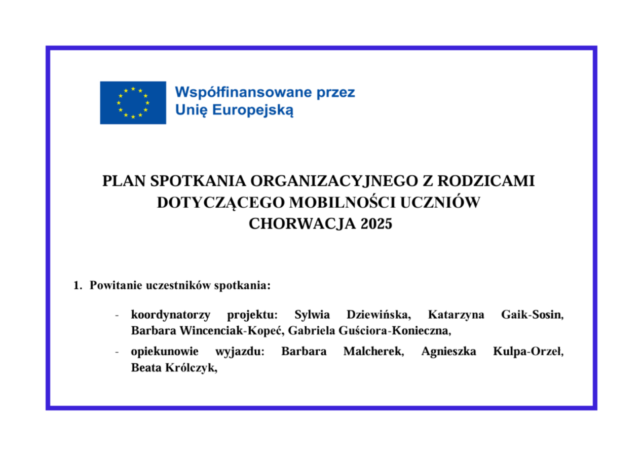W dniu 1 października 2025 roku odbyło się spotkanie koordynatorek i opiekunek projektu z rodzicami uczniów biorących udział w II mobilności uczniów w ramach programu Erasmus+ do Chorwacji.