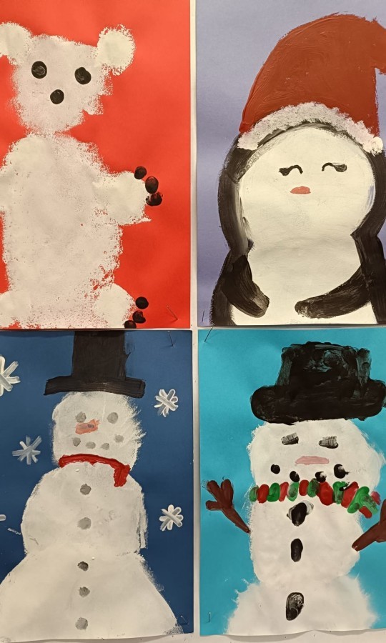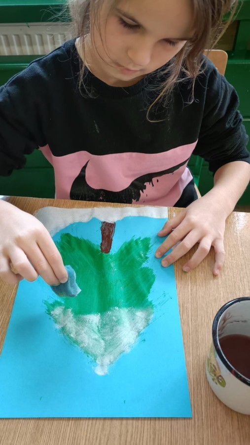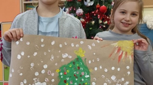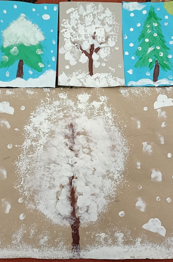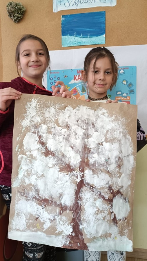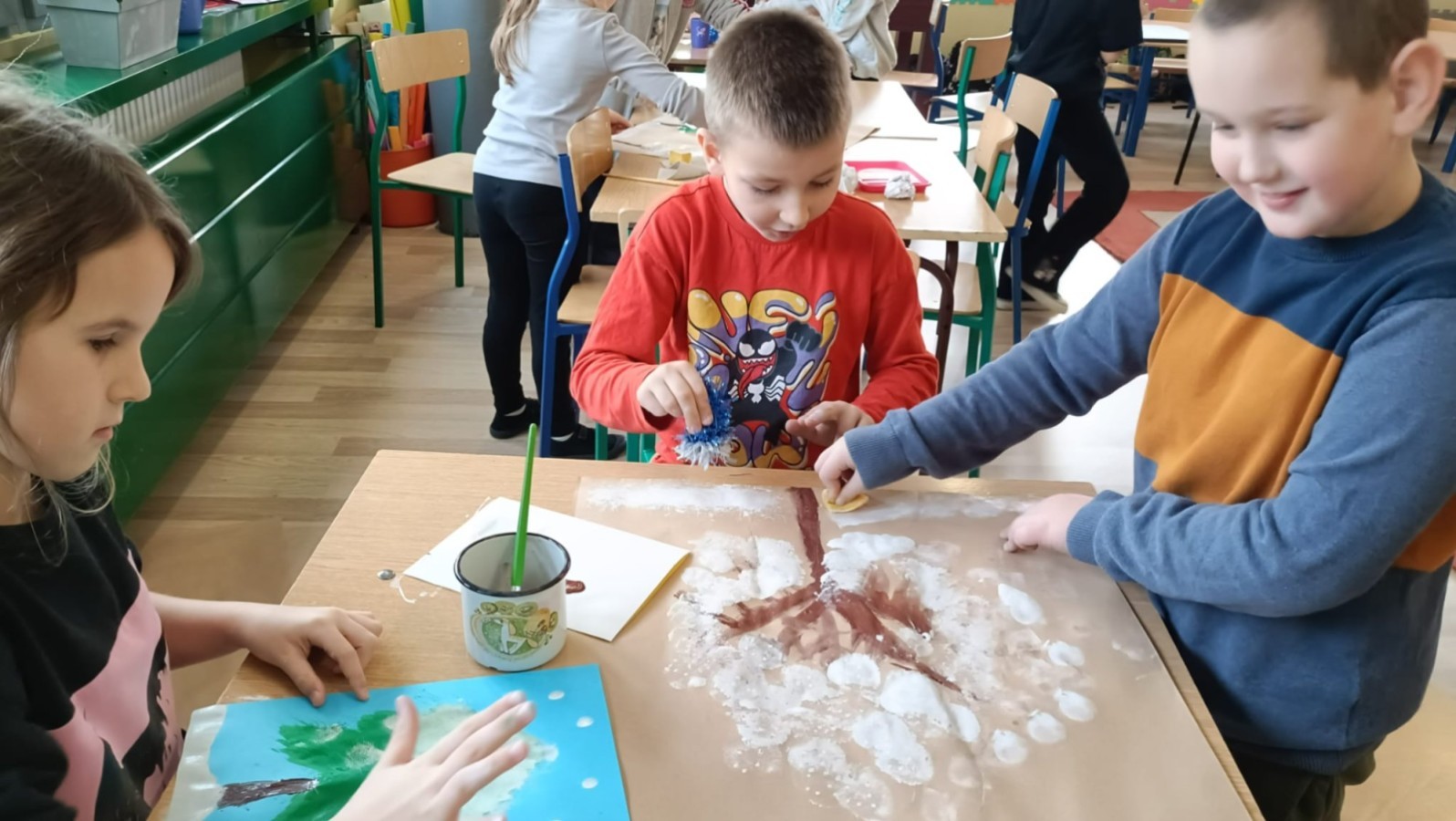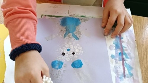 Kolejne nasze zadanie Ogólnopolskiego Projektu Edukacyjnego ,, Zabawa sztuką ' proponowało nam zastąpienie pędzla malarskiego innymi materiałami. Wykorzystaliśmy więc waciki, pompony, folię bąbelkową, filc, kawałki papieru , włóczkę i... palce dłoni. Inspiracją do naszych prac była piękna, zimowa aura za oknem. Wykorzystując nietypowe narzędzia powstały bardzo urozmaicone prace przedstawiające misie polarne, bałwanki, choinki i piękne ośnieżone drzewa.